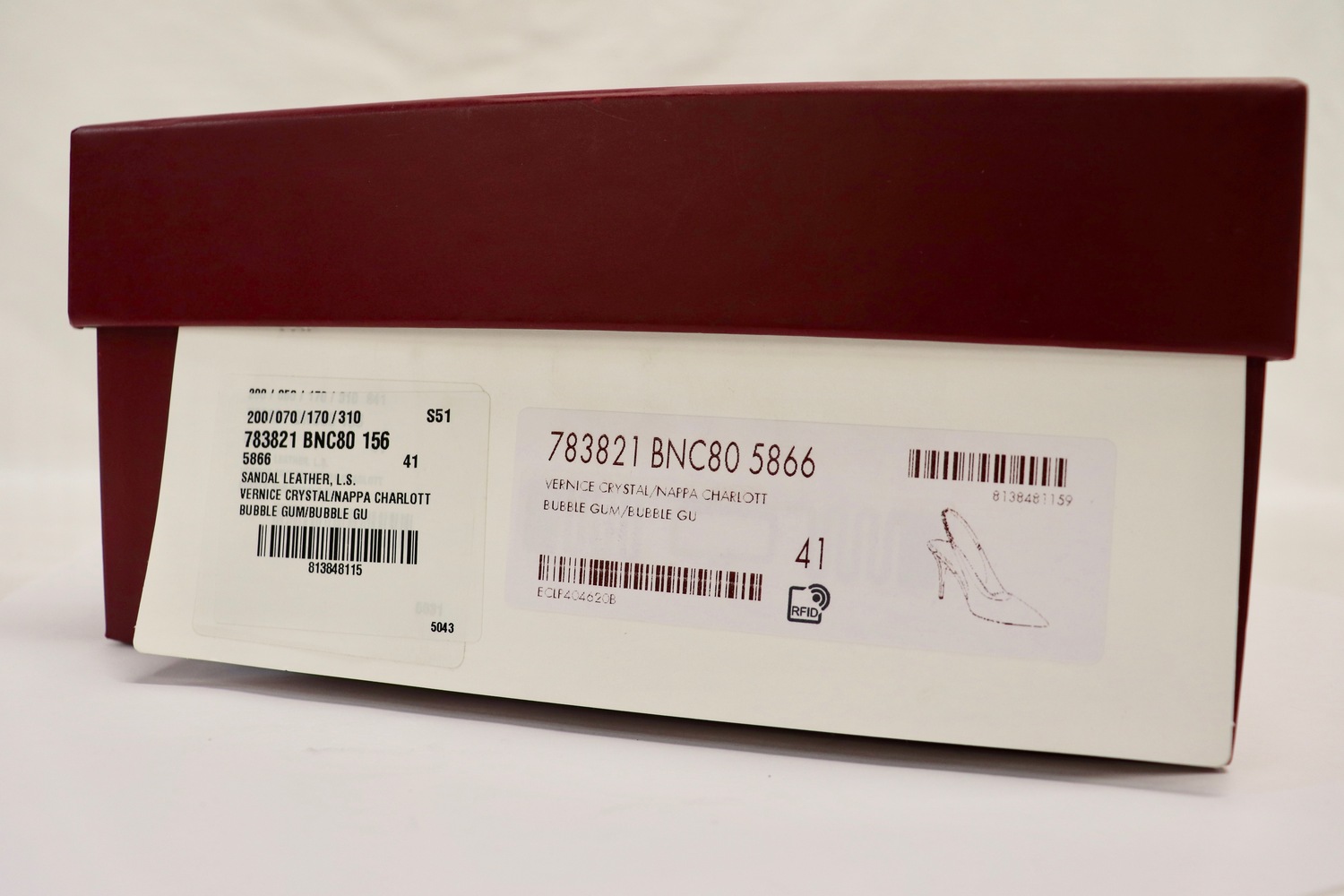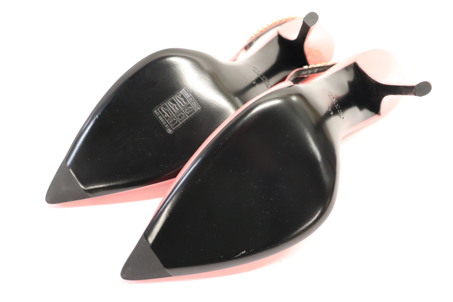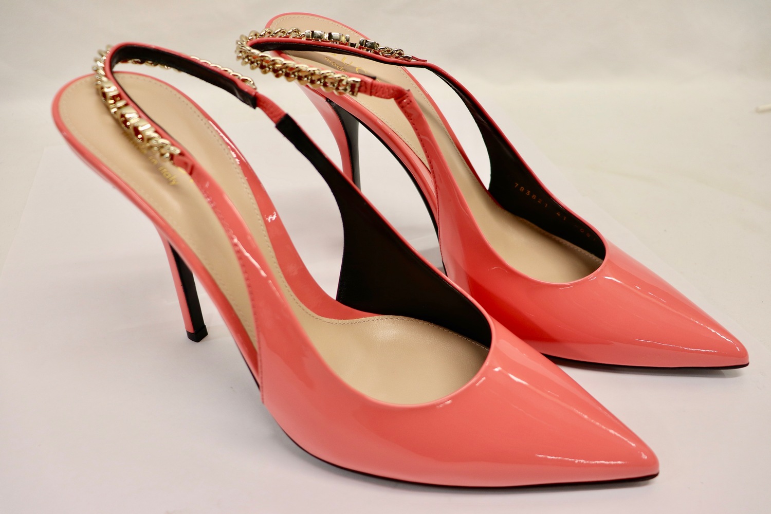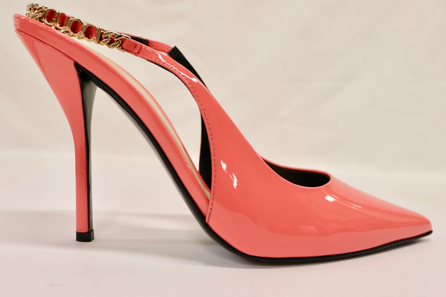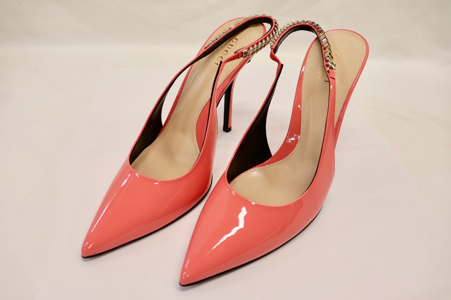 Bold, glossy, and unapologetically GUCCI. These Charlotte Slingback Pumps in “Bubble Gum” pink patent leather combine playful color with sharp sophistication. Crafted in Italy from Vernice Crystal/Nappa leather, they feature a pointed toe, slim stiletto heel, and silver-tone chain strap detail for a hint of rock-chic edge.