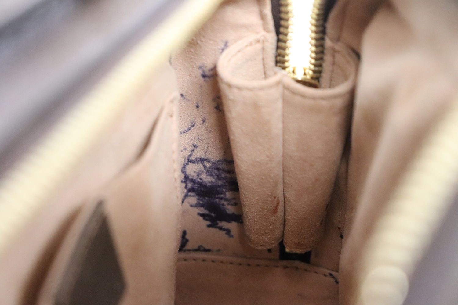 • Interior: microfiber lining with heavy ink marks, staining, and spotting (clearly shown)