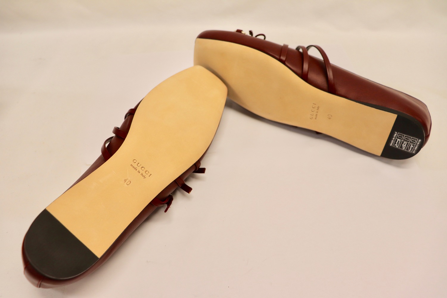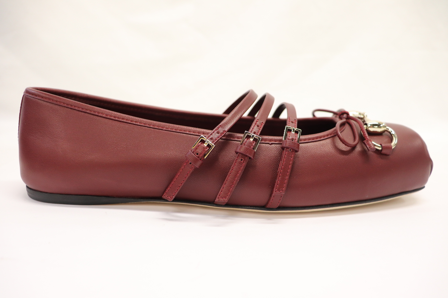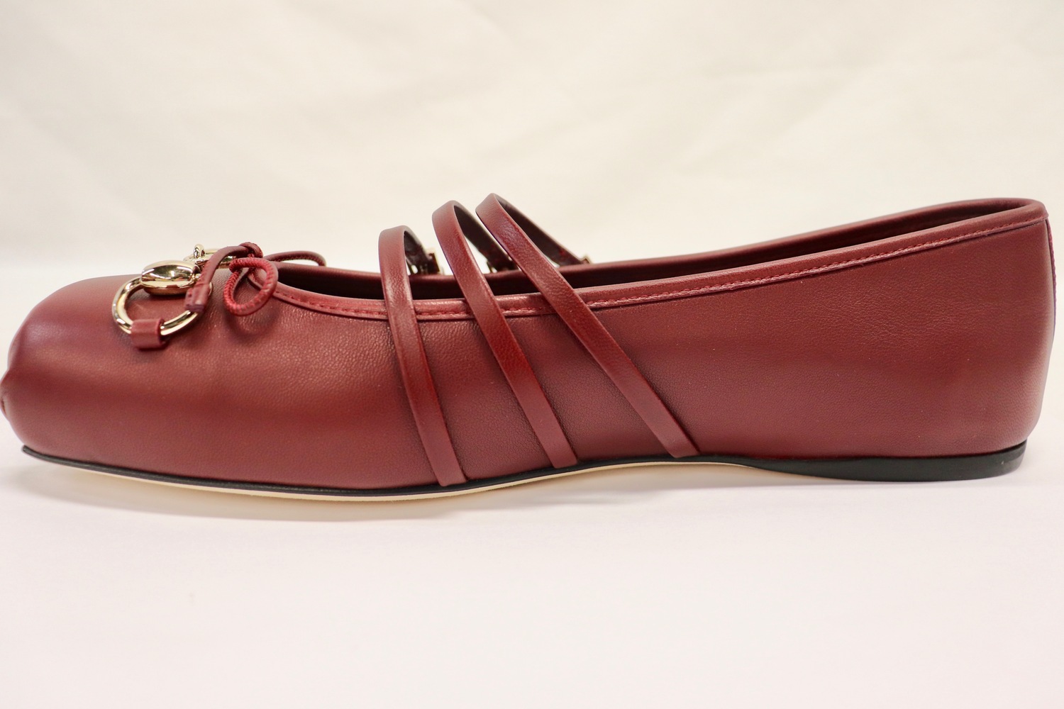 Chic, structured, and unmistakably GUCCI- these Ballet Leather Flats in Rosso Ancora (deep red) bring sophisticated vintage flair to modern luxury. Made in Italy from soft Nappa Camargue leather, they feature three dainty buckled straps across the instep, the iconic horsebit detail at the toe, and a refined square toe silhouette.