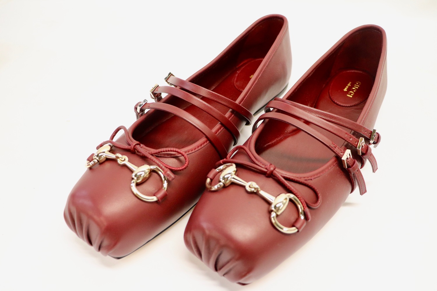 Chic, structured, and unmistakably GUCCI- these Ballet Leather Flats in Rosso Ancora (deep red) bring sophisticated vintage flair to modern luxury. Made in Italy from soft Nappa Camargue leather, they feature three dainty buckled straps across the instep, the iconic horsebit detail at the toe, and a refined square toe silhouette.