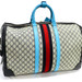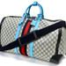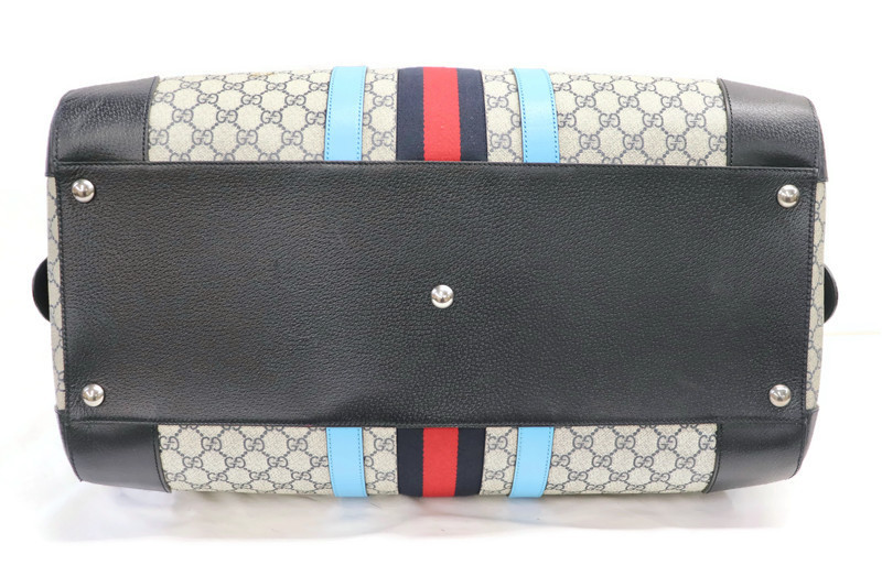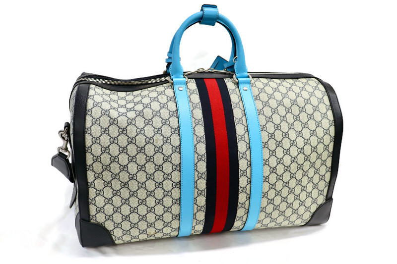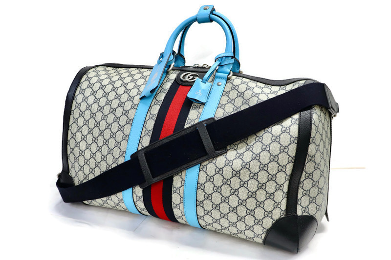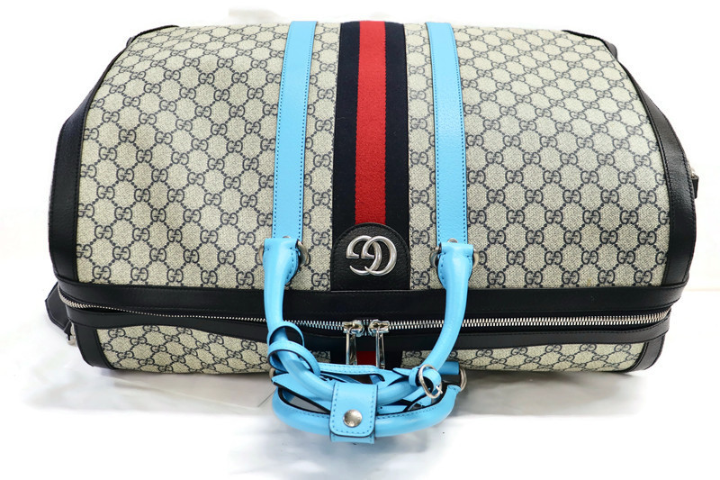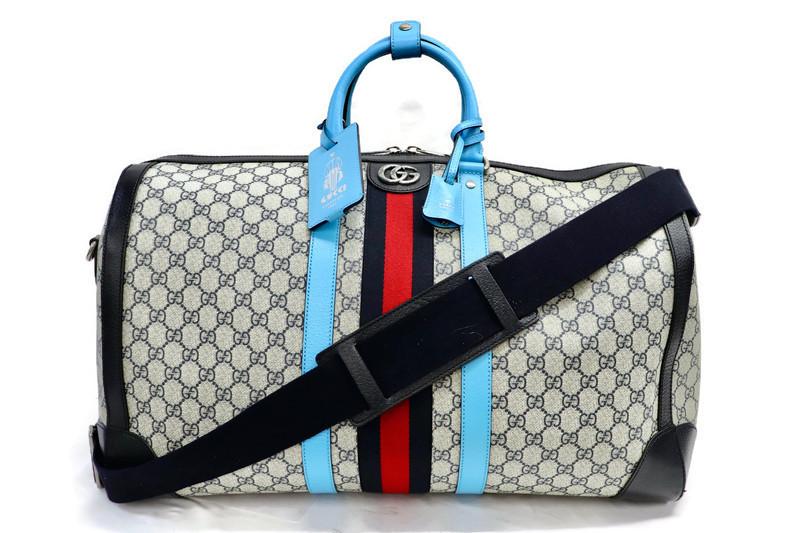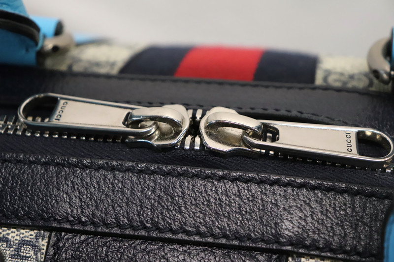 Authentic GUCCI Savoy Large Duffle (style #724612 / 525040) in GG Supreme monogram coated canvas with striking navy and baby-blue leather trim, accented by wide navy/red Web stripe, luggage tag, handle keeper, padlock with 2 keys in leather bell tassel, and removable wide cotton shoulder strap. Very lightly used condition- two minor scuffs on corners (see close-ups), interior clean and odor-free, hardware bright and functional, structure solid.