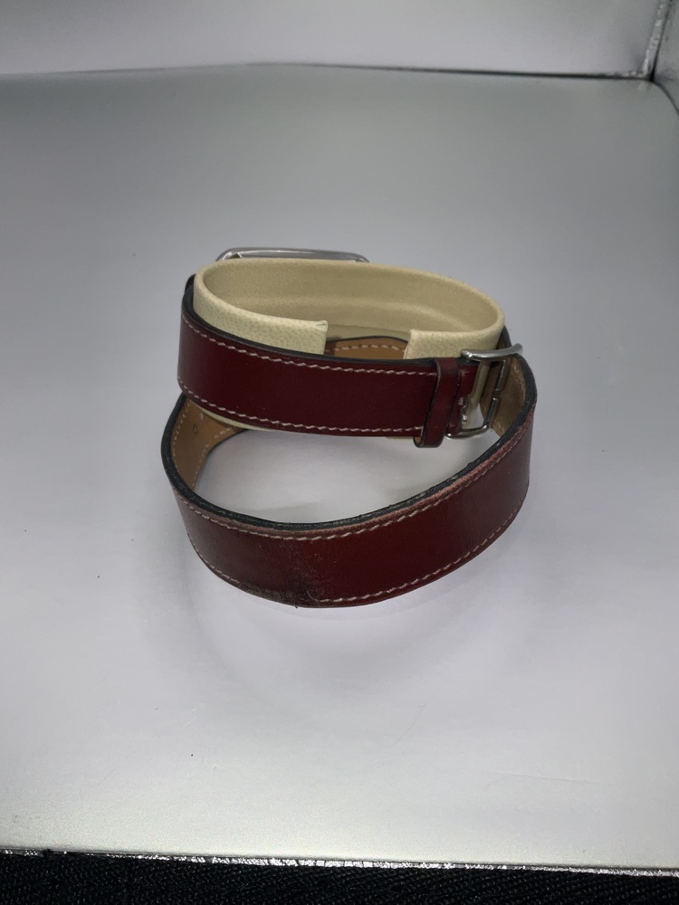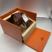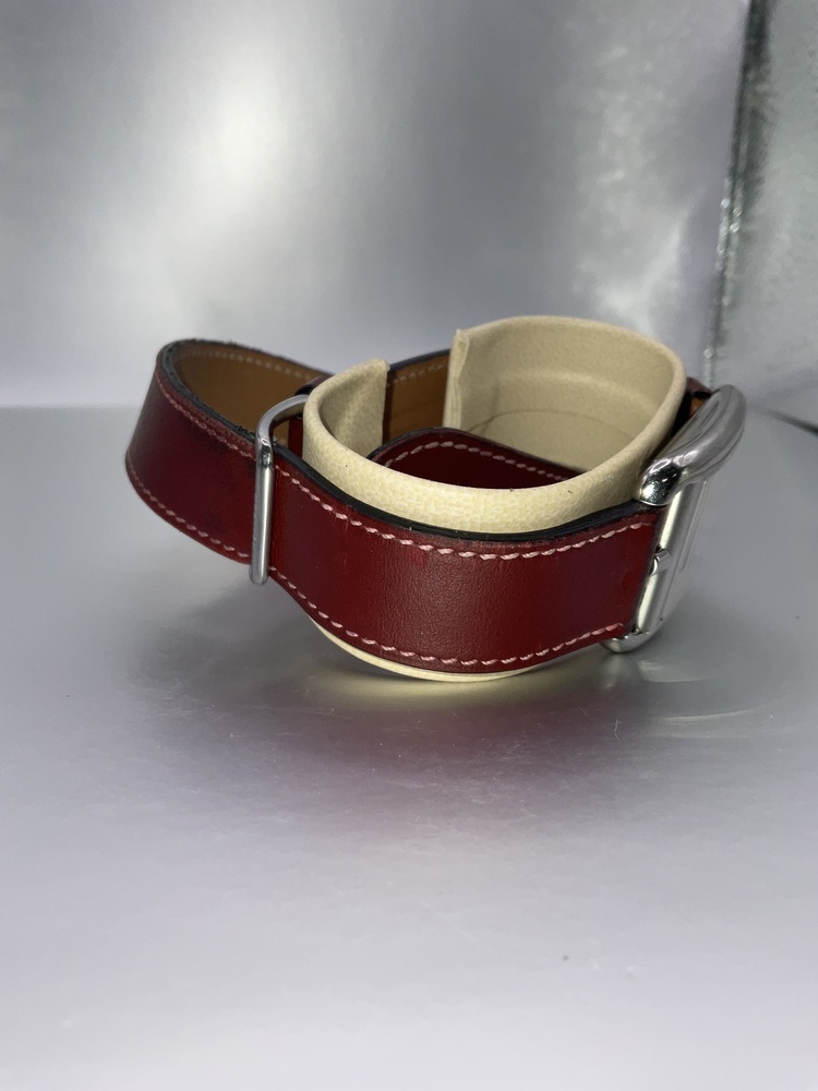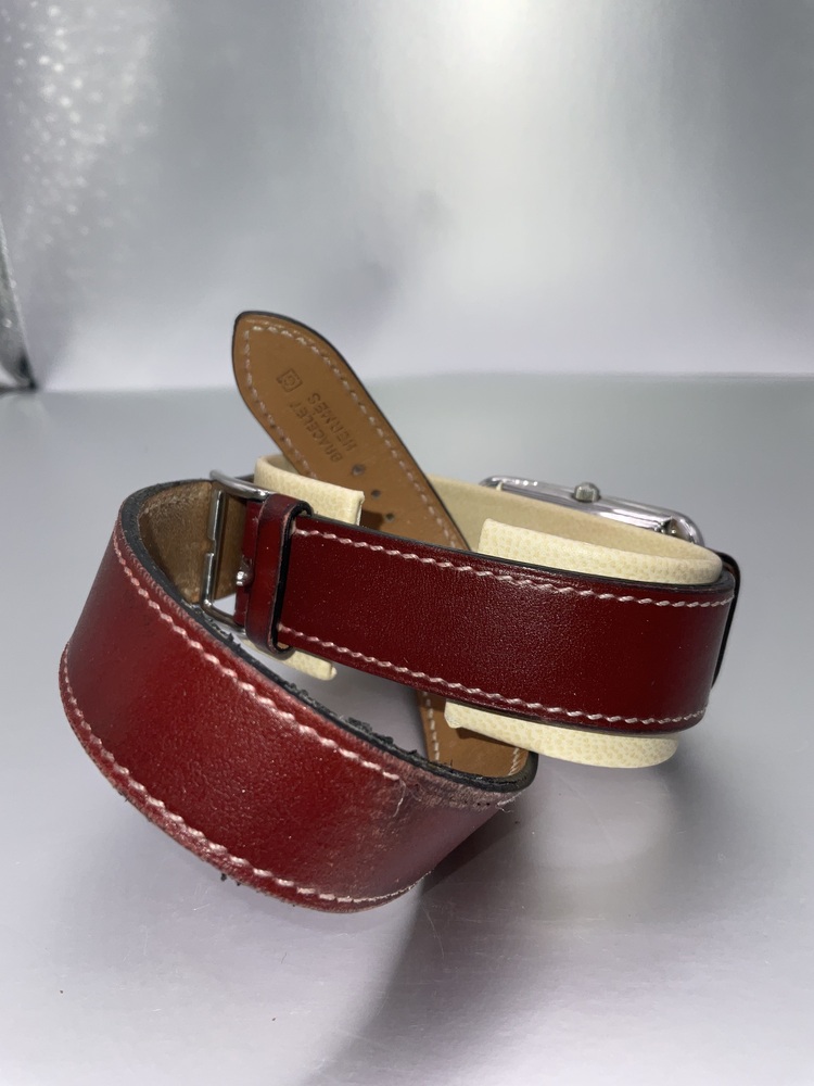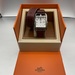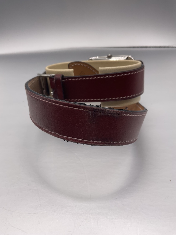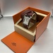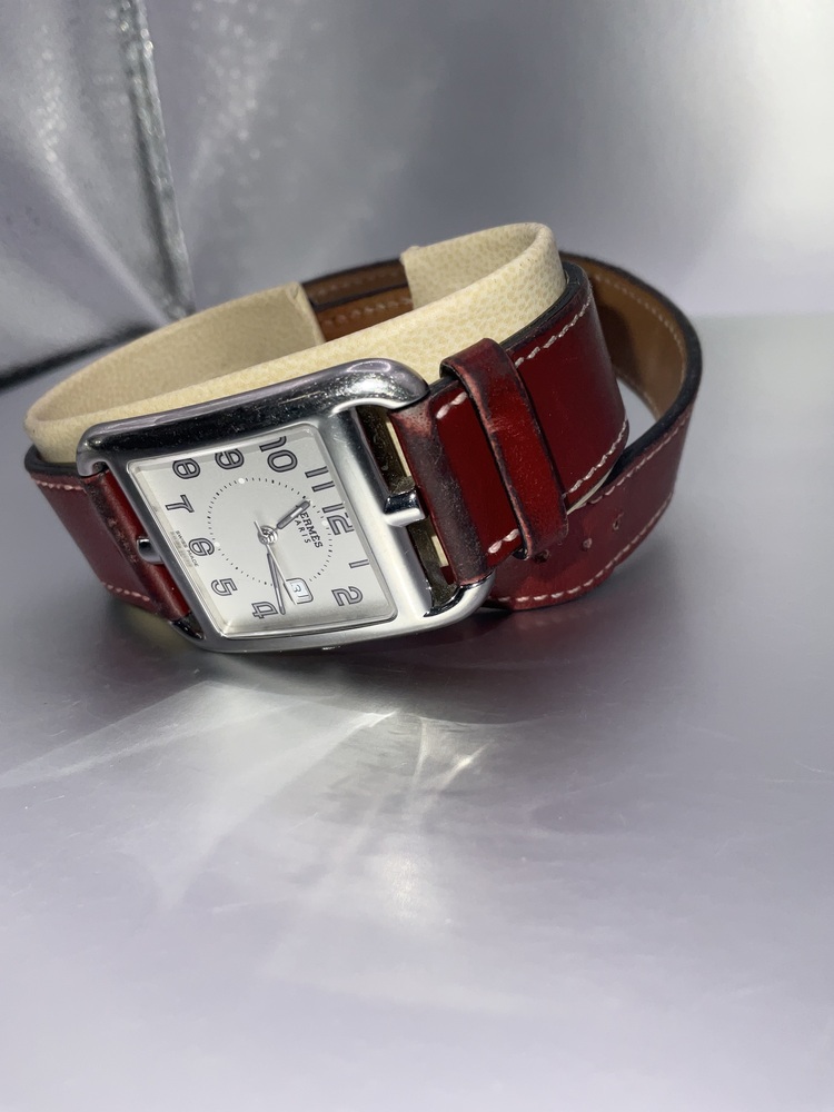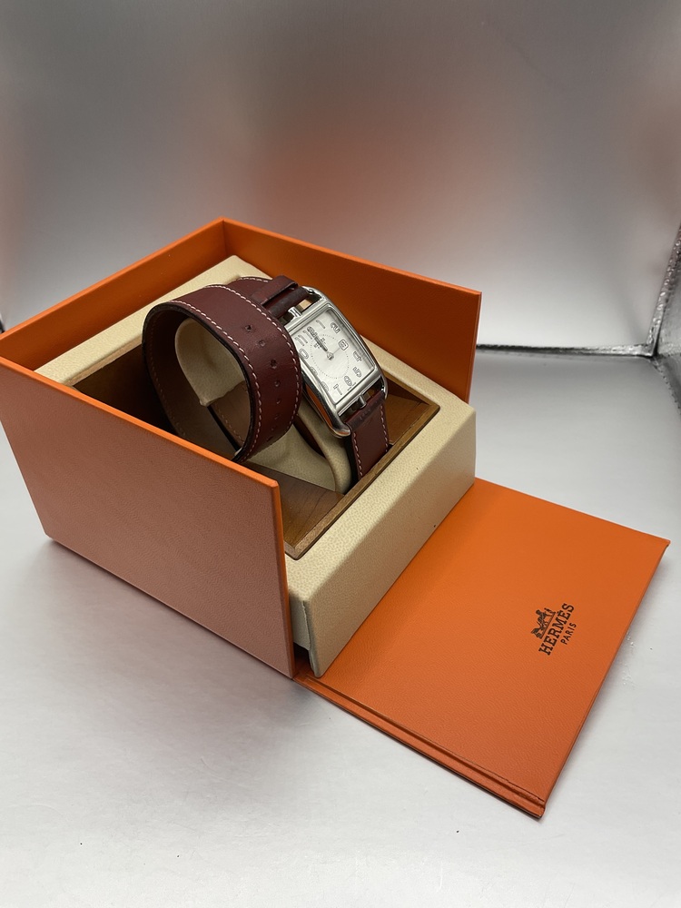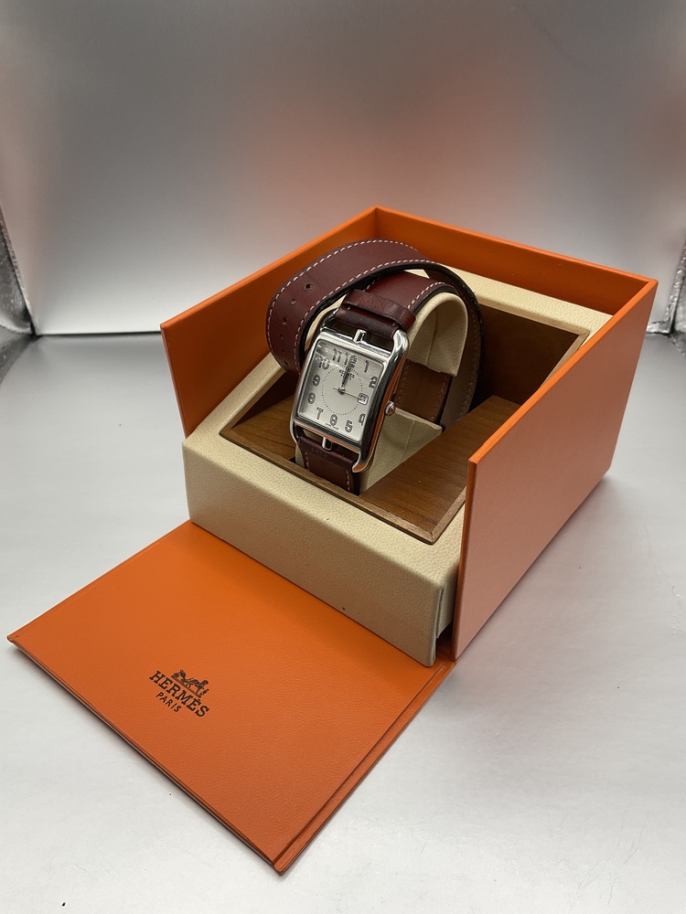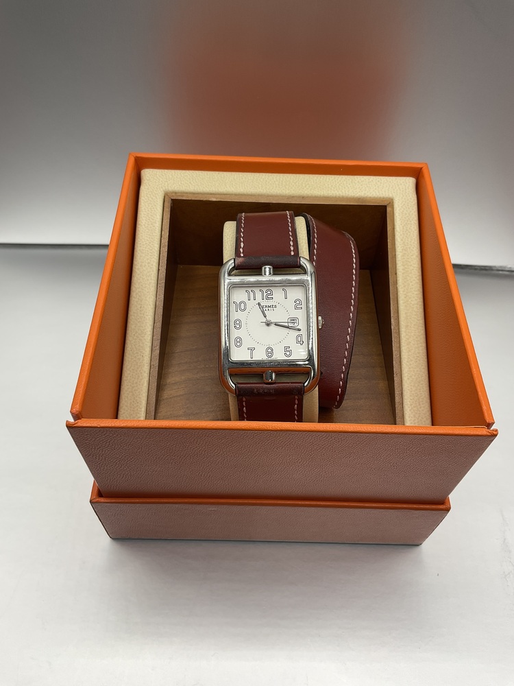 Presenting the distinguished HERMES Cape Cod Double Tour Automatic Watch Fauve - a testament to the craftsmanship synonymous with the brand. Encased in sturdy stainless steel, the 29mm face features a luminous white dial marked with bold Arabic numerals. Its heart beats via an automatic movement, shielded beneath a premium sapphire crystal. The crowning glory lies in its rich brown Barenia calfskin strap that lightly grazes your wrist, culminating in a timeless piece made for the discerning few.