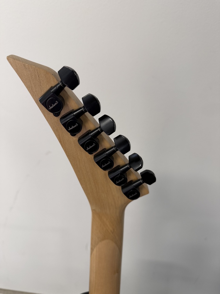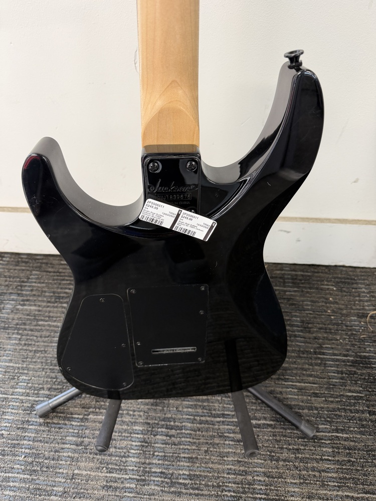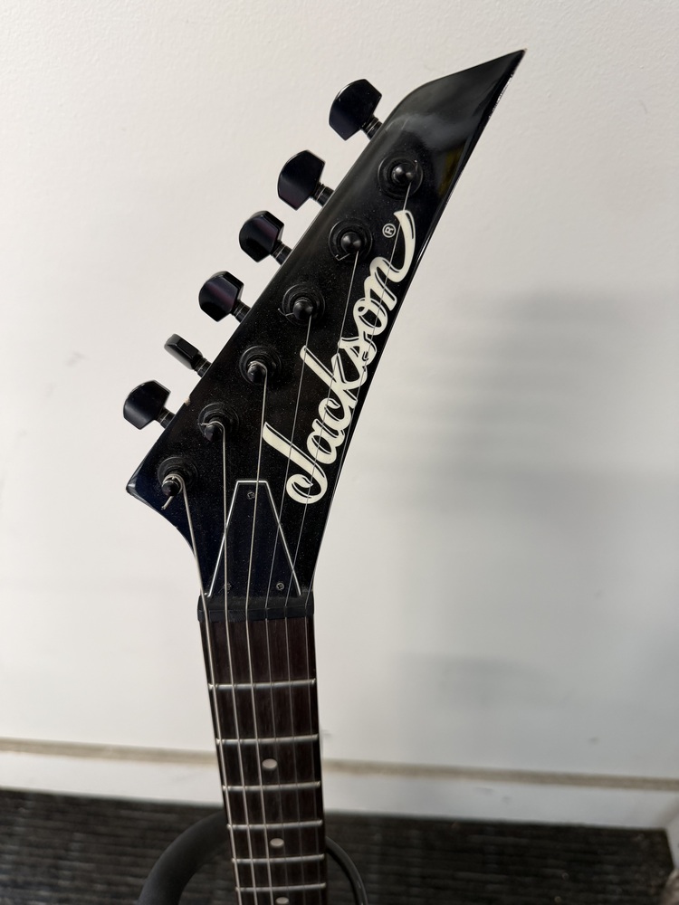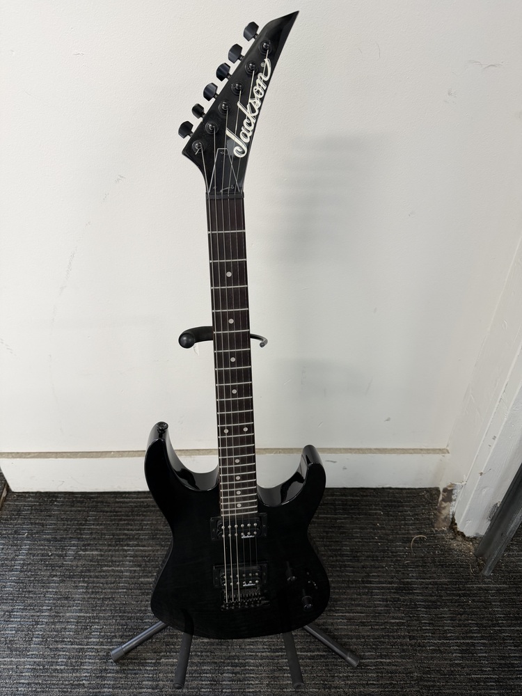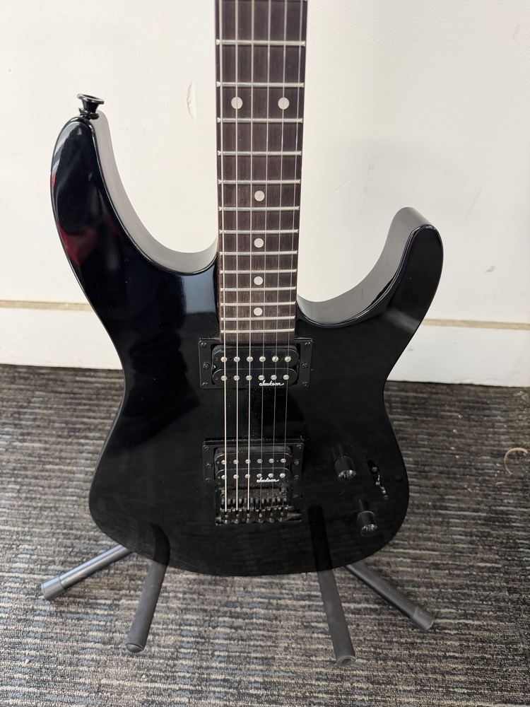 This Jackson electric guitar features a sleek black solid body with a fast-playing neck and dual humbuckers for powerful tone. Ideal for rock and metal players, beginners, or anyone looking for an affordable Jackson guitar. Electronics work as they should, and it plays well. Normal cosmetic wear is present from use but does not affect performance. Please review photos carefully for condition details.