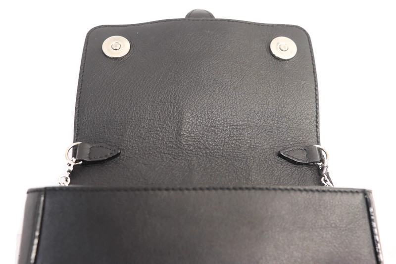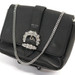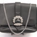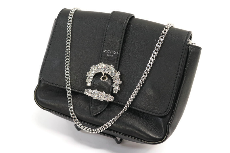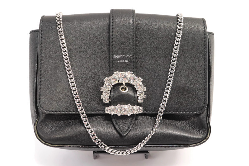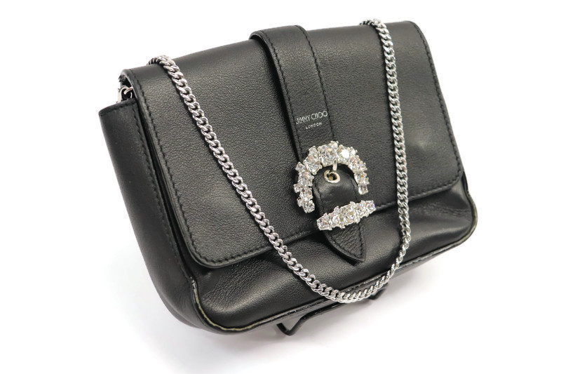 Gorgeous and glam with a touch of rock and roll energy, this Jimmy Choo Chérie small crossbody brings the sparkle with its rhinestone-studded faux buckle and smooth black leather. Compact, chic, and ideal for hands-free nights out. Includes removable skinny chain strap. Clean interior, no odors.