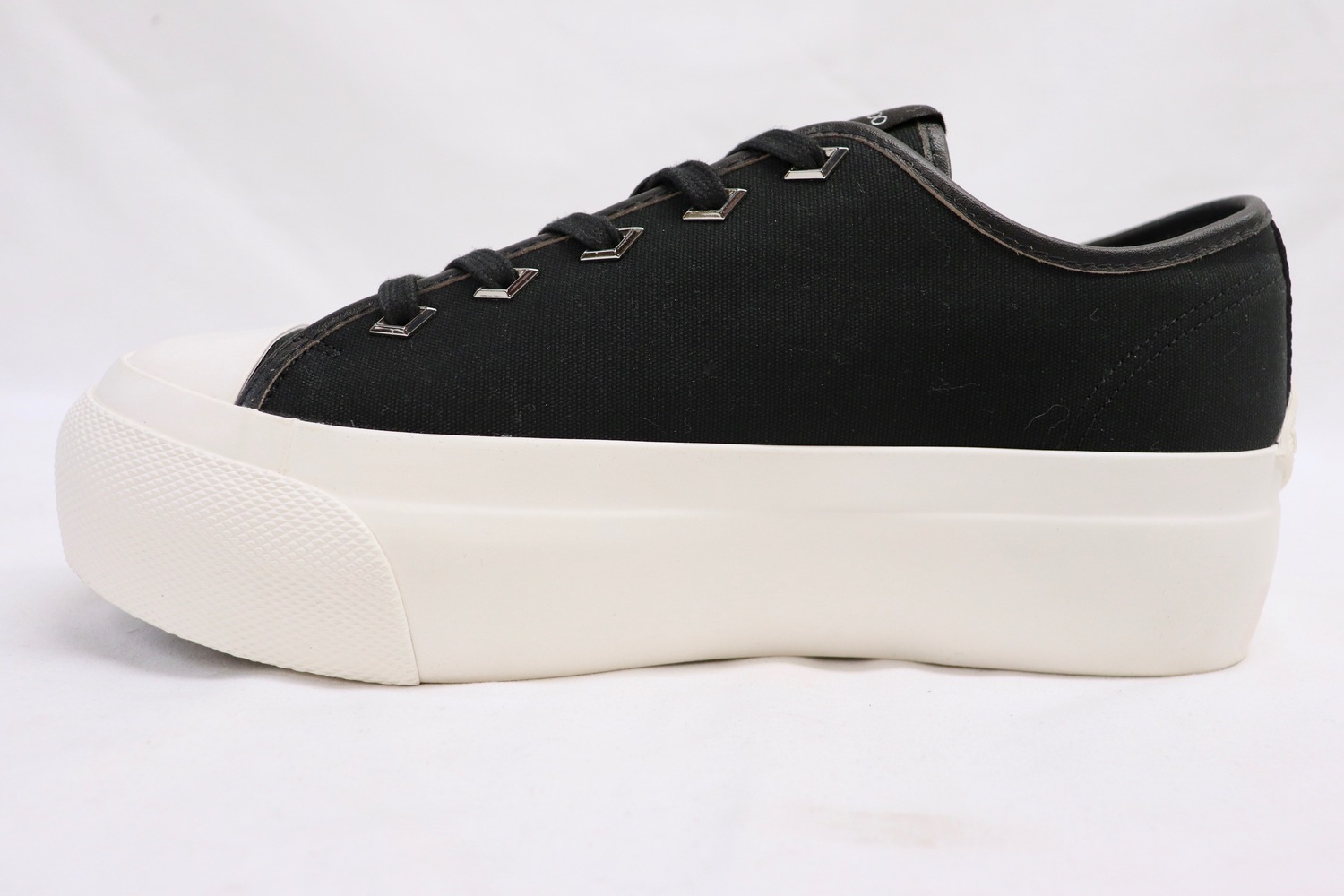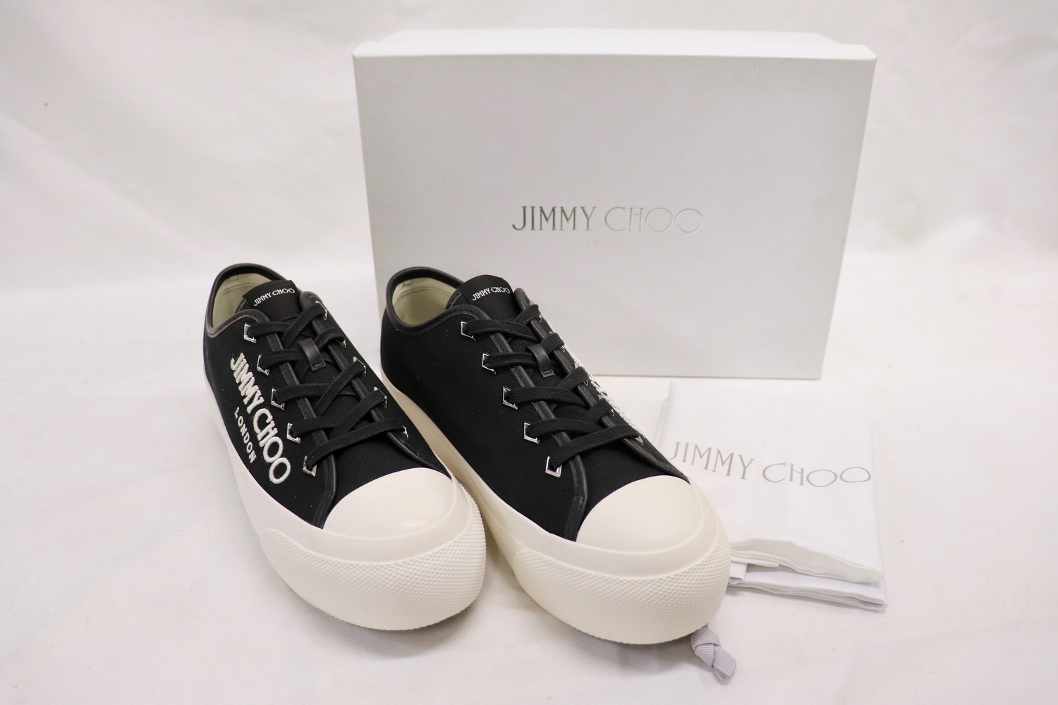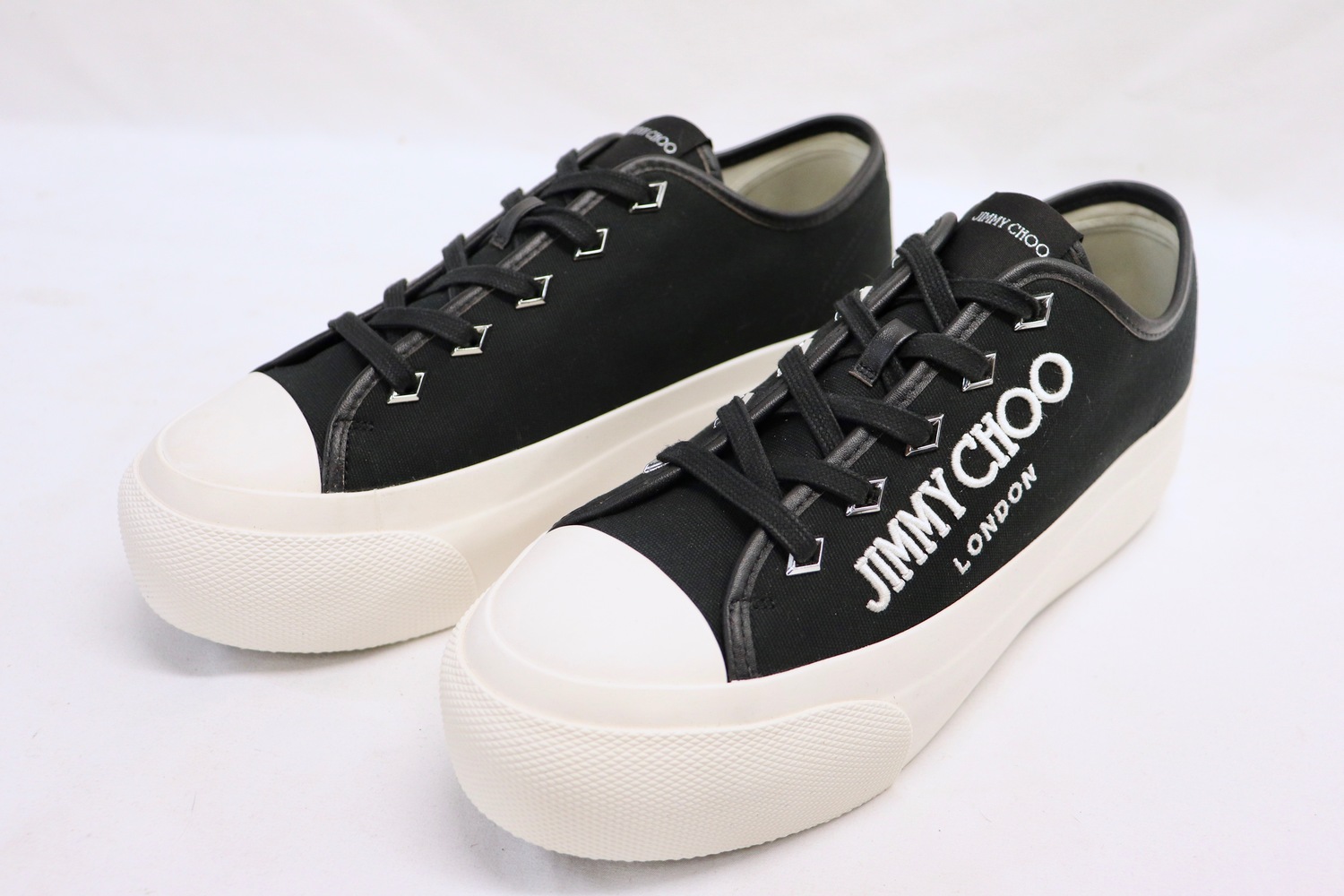 Authentic Jimmy Choo Palma Maxi/F platform sneakers in black canvas with bold white rubber platform soles and logo embroidery. A modern luxury sneaker with elevated streetwear style.