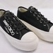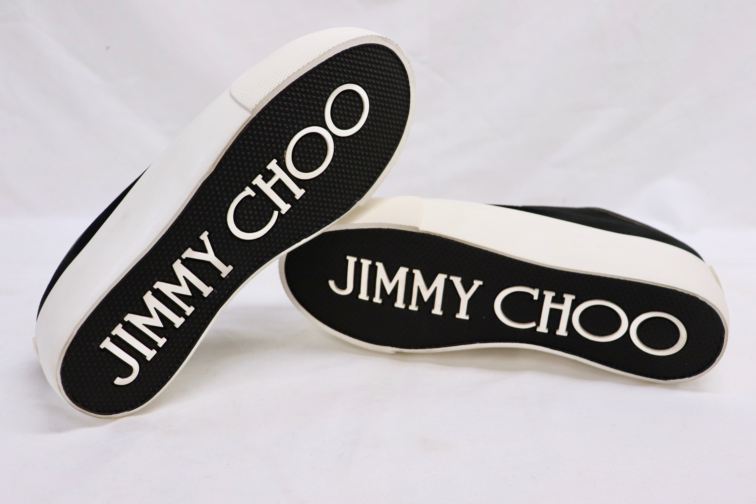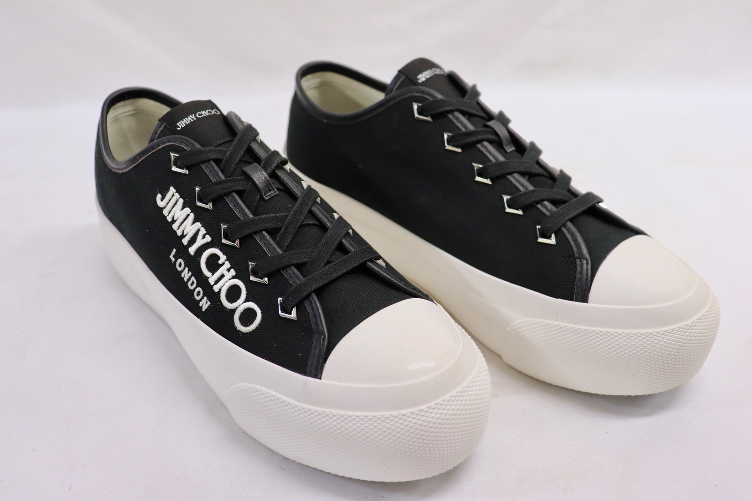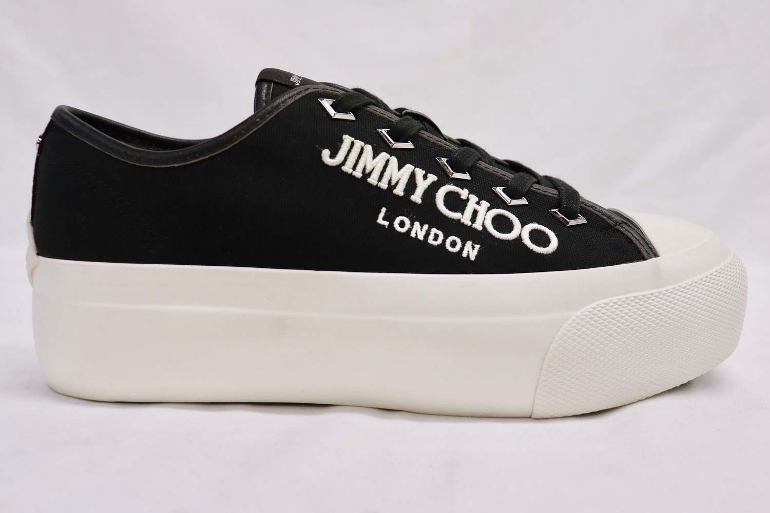 Authentic Jimmy Choo Palma Maxi/F platform sneakers in black canvas with bold white rubber platform soles and logo embroidery. A modern luxury sneaker with elevated streetwear style.