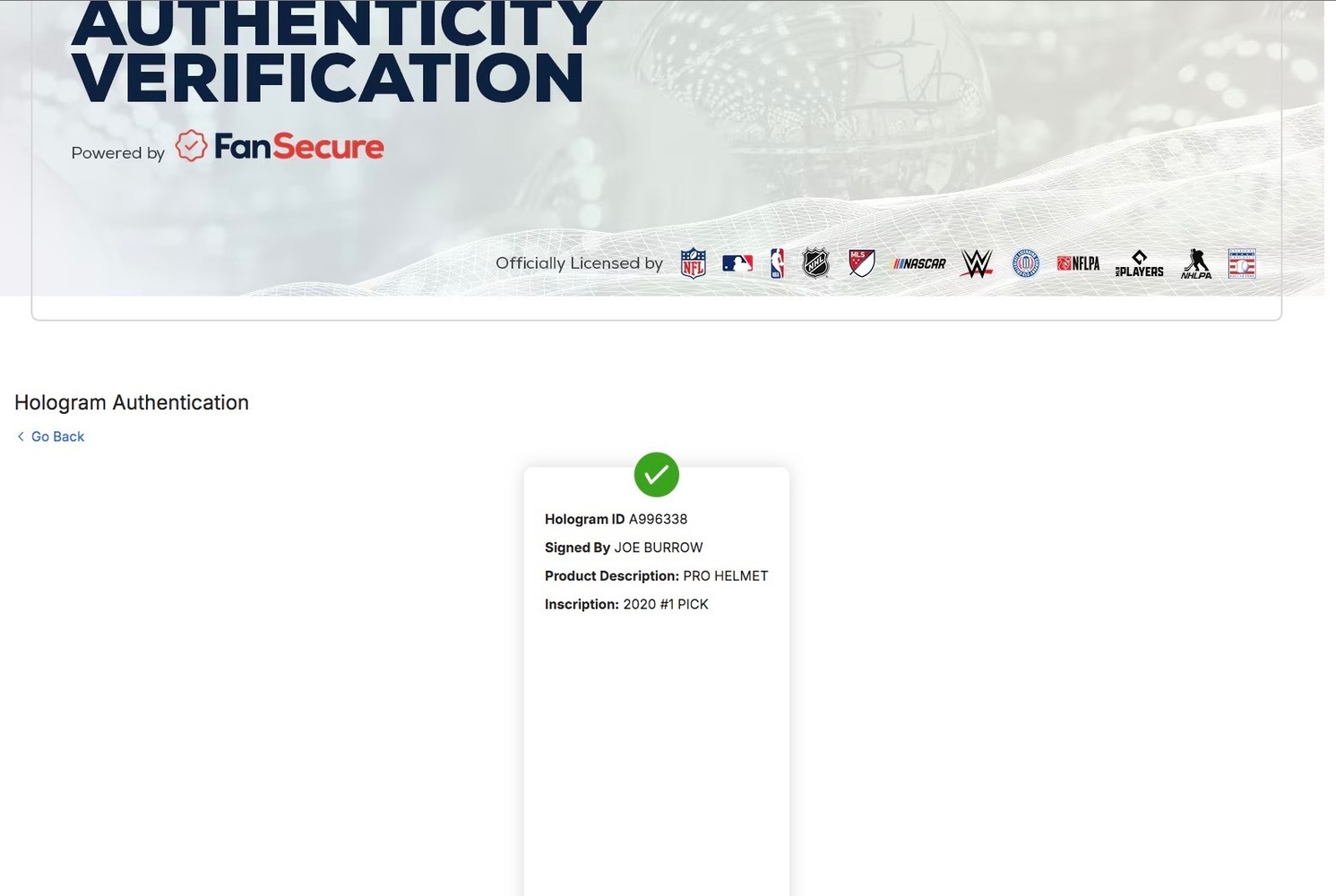 • QR code verifies directly in Fanatics database