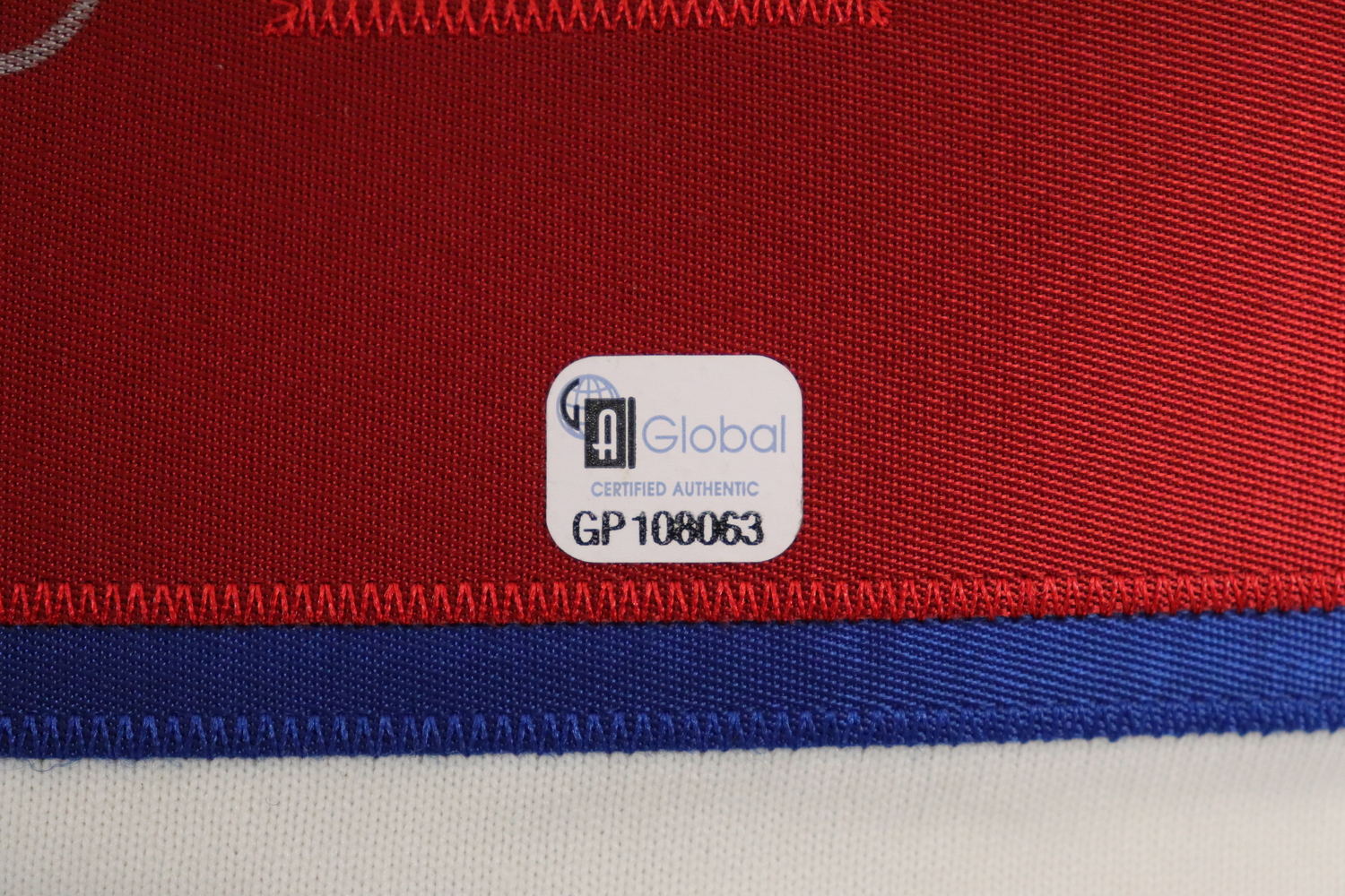 The jersey is a Mitchell & Ness Hardwood Classics reproduction and is signed cleanly on the number in silver/white paint pen. Authentication is provided by Global Authentics, with a matching hologram sticker (GP108063) that verifies successfully in their database.