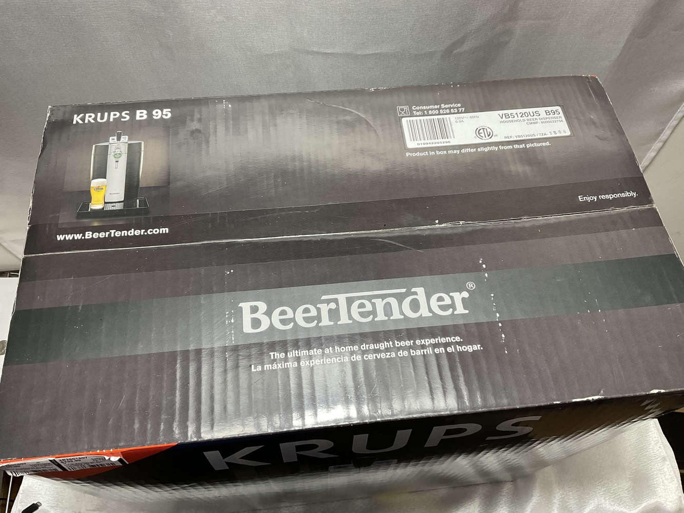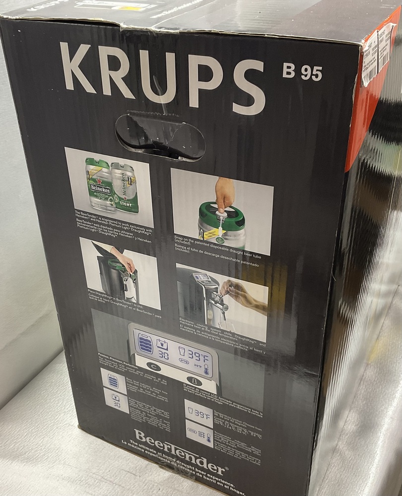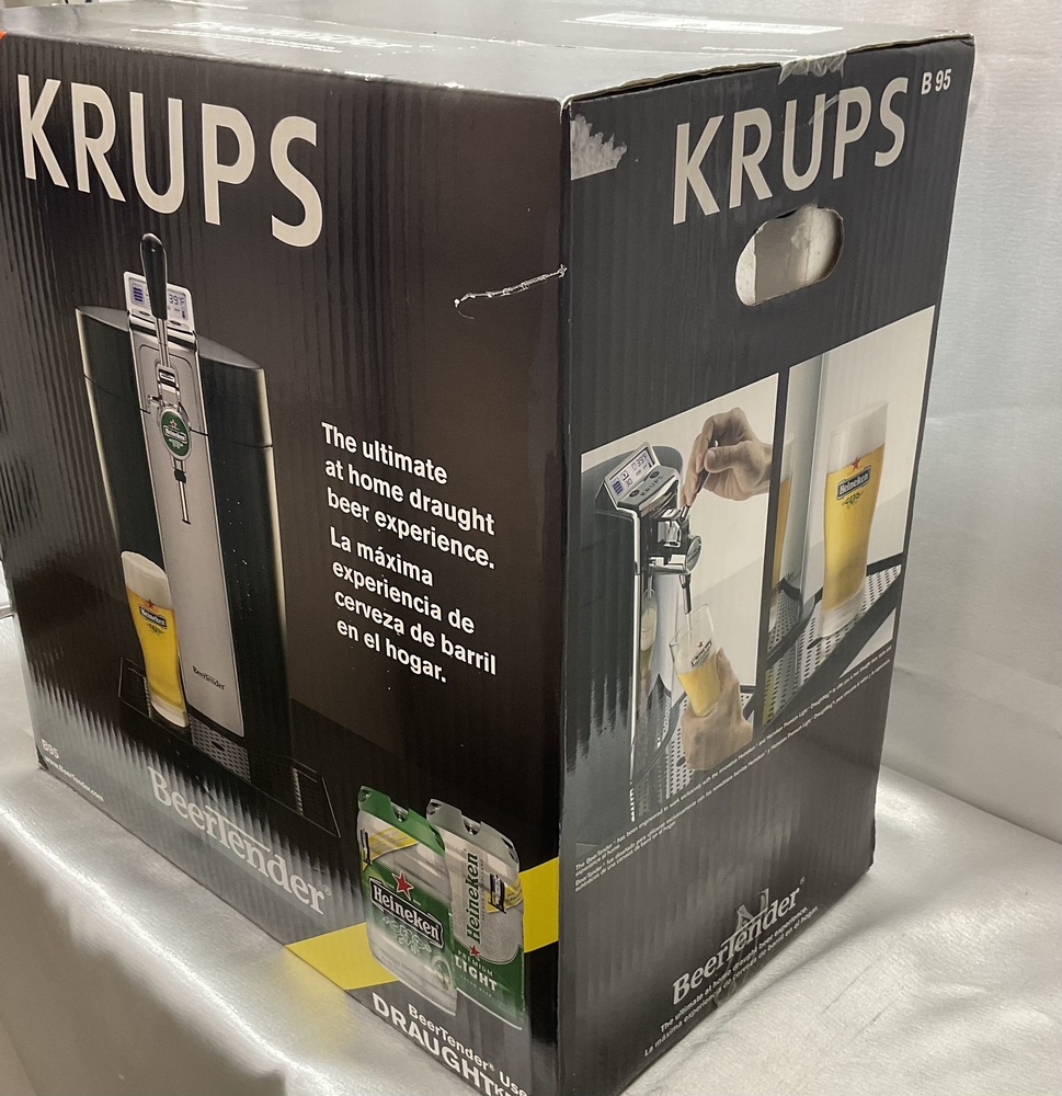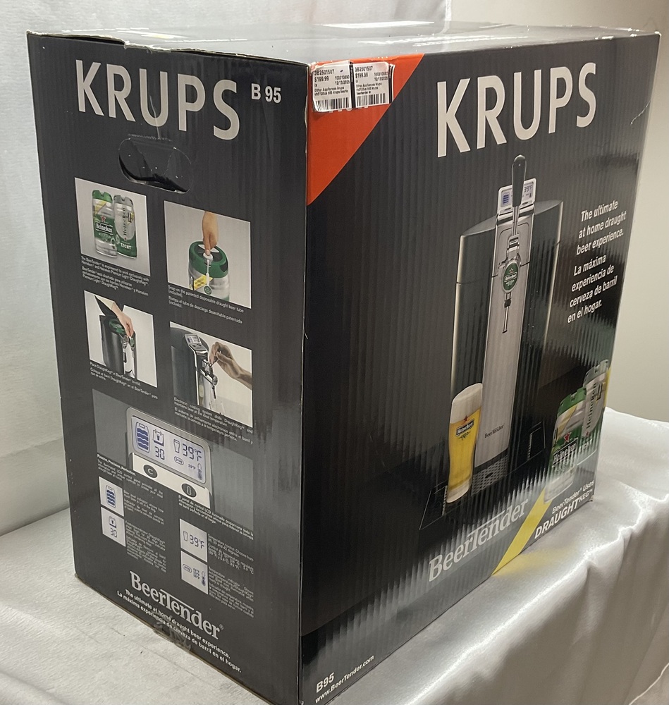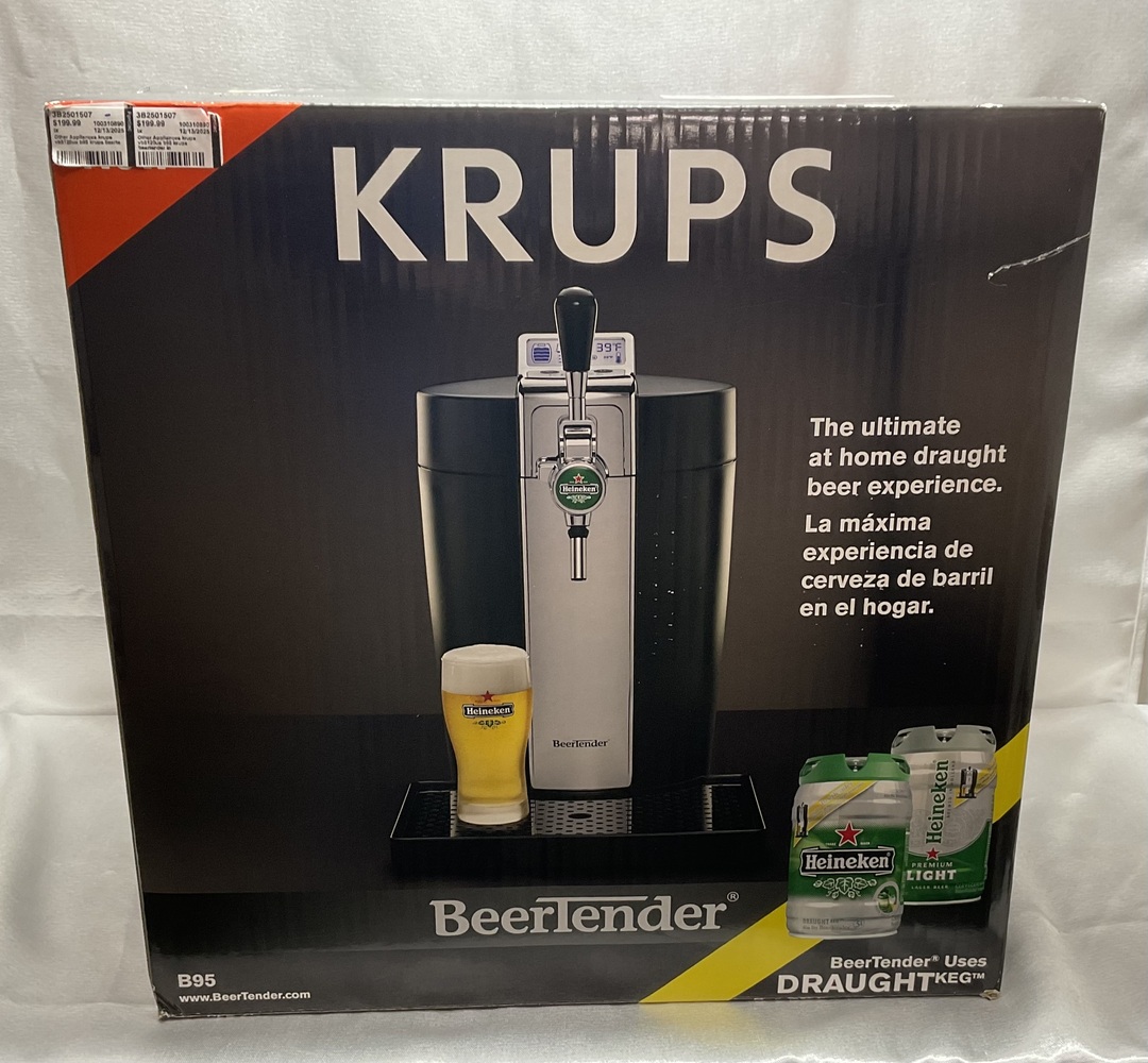 The Krups VB5120US B95 Beertender is an advanced, efficient appliance. It's engineered to be compatible with Heineken DraughtKeg and Heineken Premium Light DraughtKeg. This sophisticated unit features an LED display with volume and temperature indicators. Offering high performance, it's sealed in the original box.