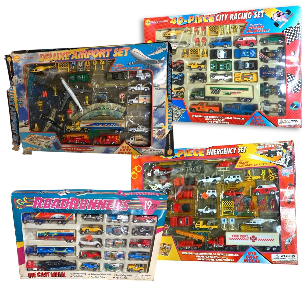 This listing is for a lot of four (4) vintage die-cast car playsets. All sets are used and may be incomplete. Please read details carefully and review photos for exact contents.
