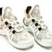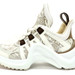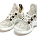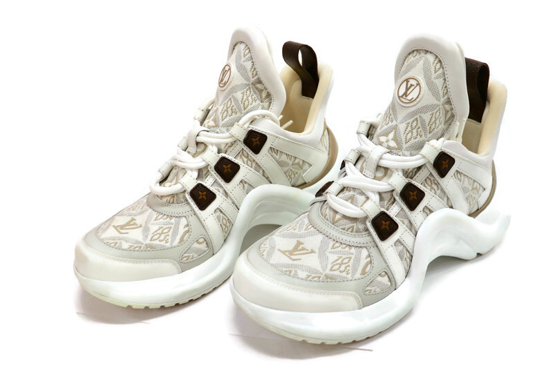 These iconic LV Archlight 1854 women’s sneakers (model 1AHOQ4) come in a crisp neutral monogram jacquard with smooth leather trim and that signature futuristic wave sole. Very good overall condition: the uppers show no notable wear, interiors are clean, and structure is firm. Soles show darkened staining from outdoor wear, and the right shoe has a small puncture on the rear platform (see photos). Includes original box, dust bags, and purchase receipt.