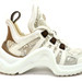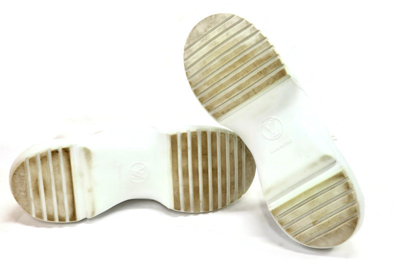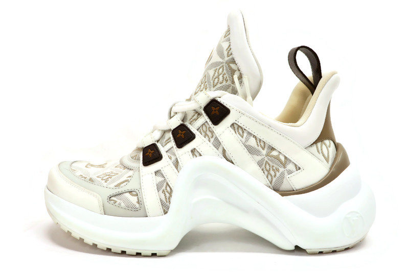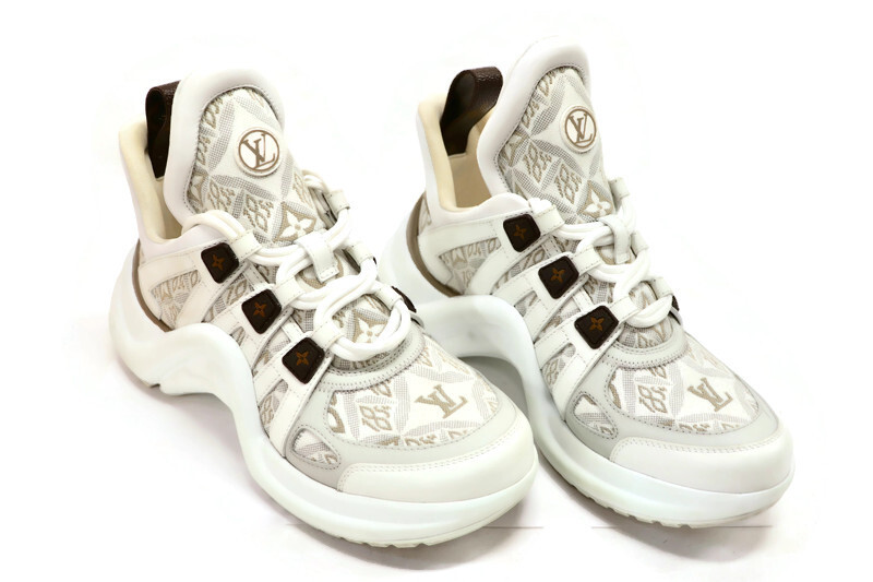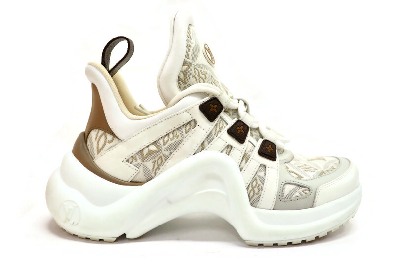 These iconic LV Archlight 1854 women’s sneakers (model 1AHOQ4) come in a crisp neutral monogram jacquard with smooth leather trim and that signature futuristic wave sole. Very good overall condition: the uppers show no notable wear, interiors are clean, and structure is firm. Soles show darkened staining from outdoor wear, and the right shoe has a small puncture on the rear platform (see photos). Includes original box, dust bags, and purchase receipt.
