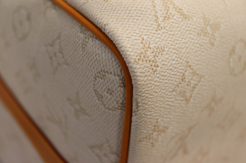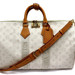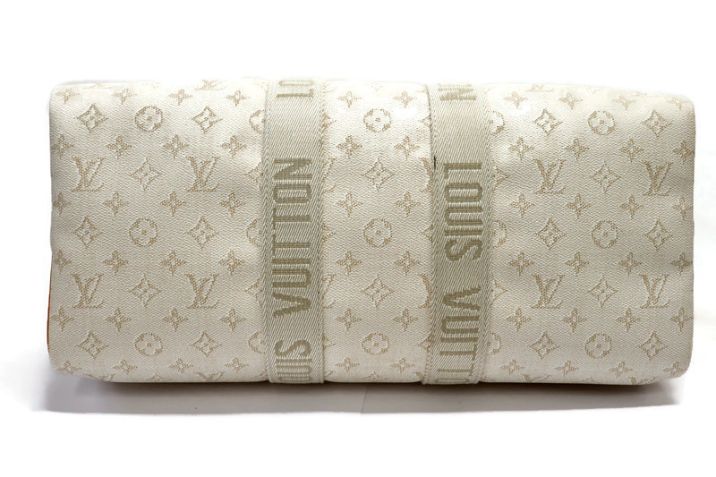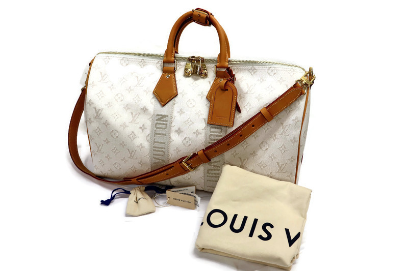 An absolutely stunning Louis Vuitton Keepall Bandoulière 45 in the rare Herblay Off-White Monogram canvas, trimmed in natural vachetta leather. This exclusive edition combines classic LV heritage with modern elegance- perfect as a carry-on, weekender, or statement travel piece.