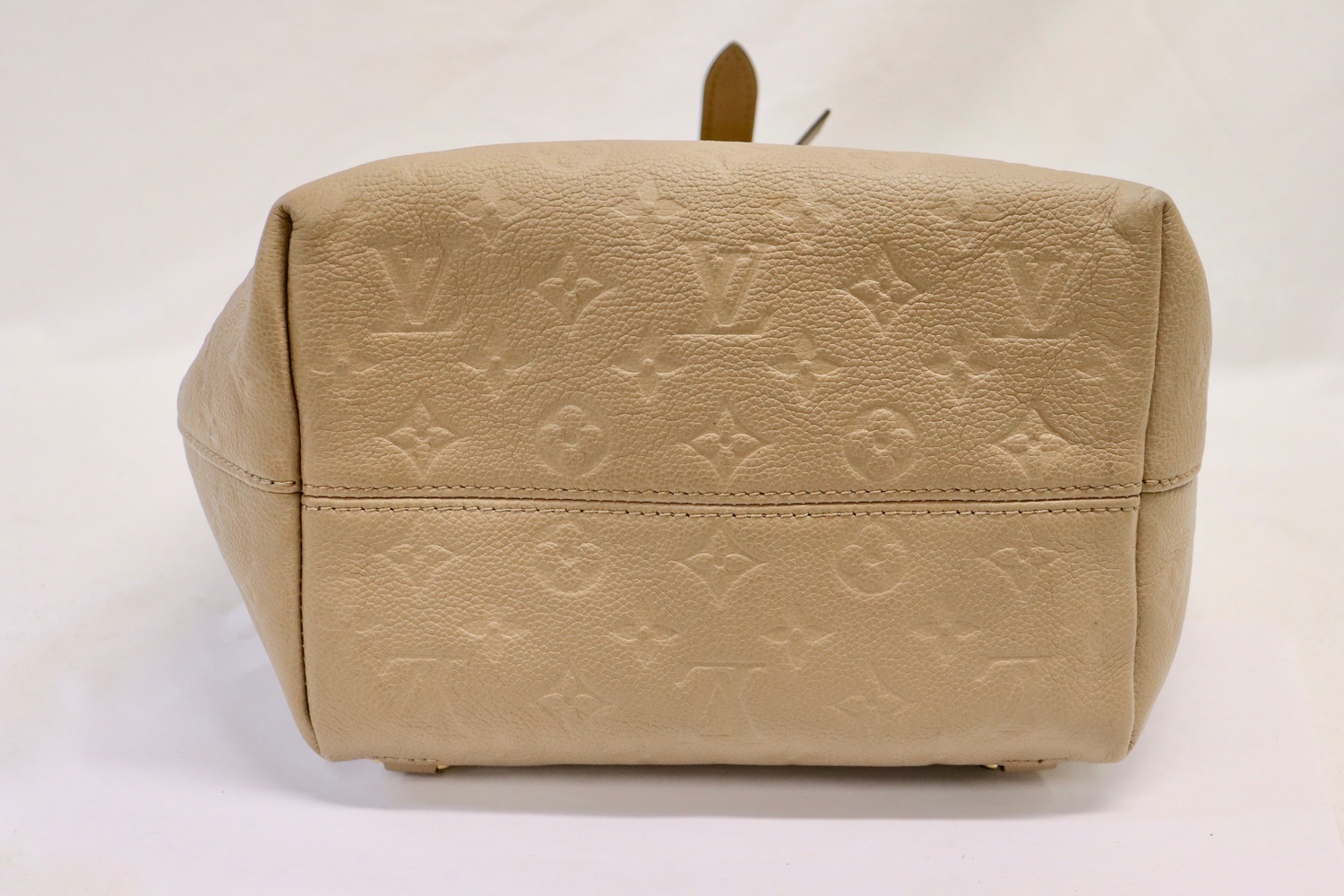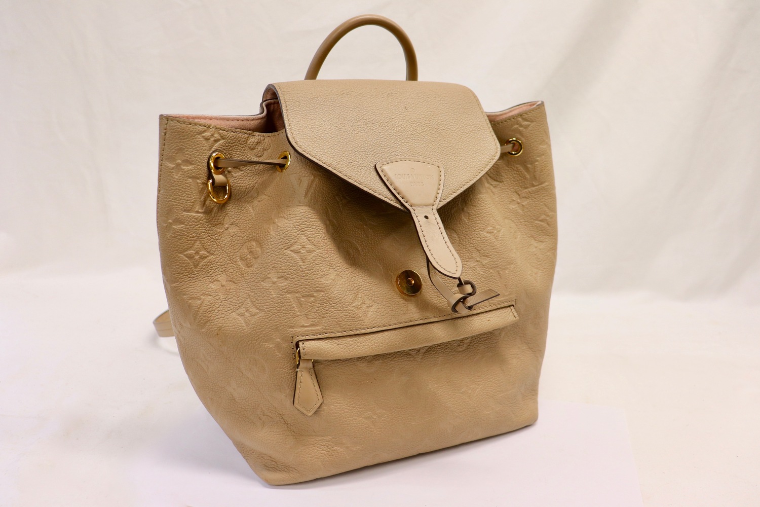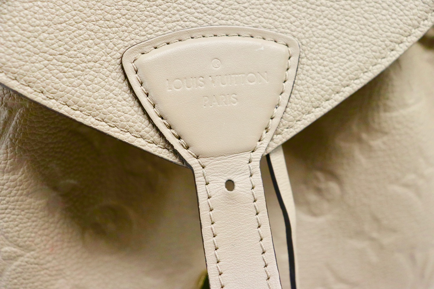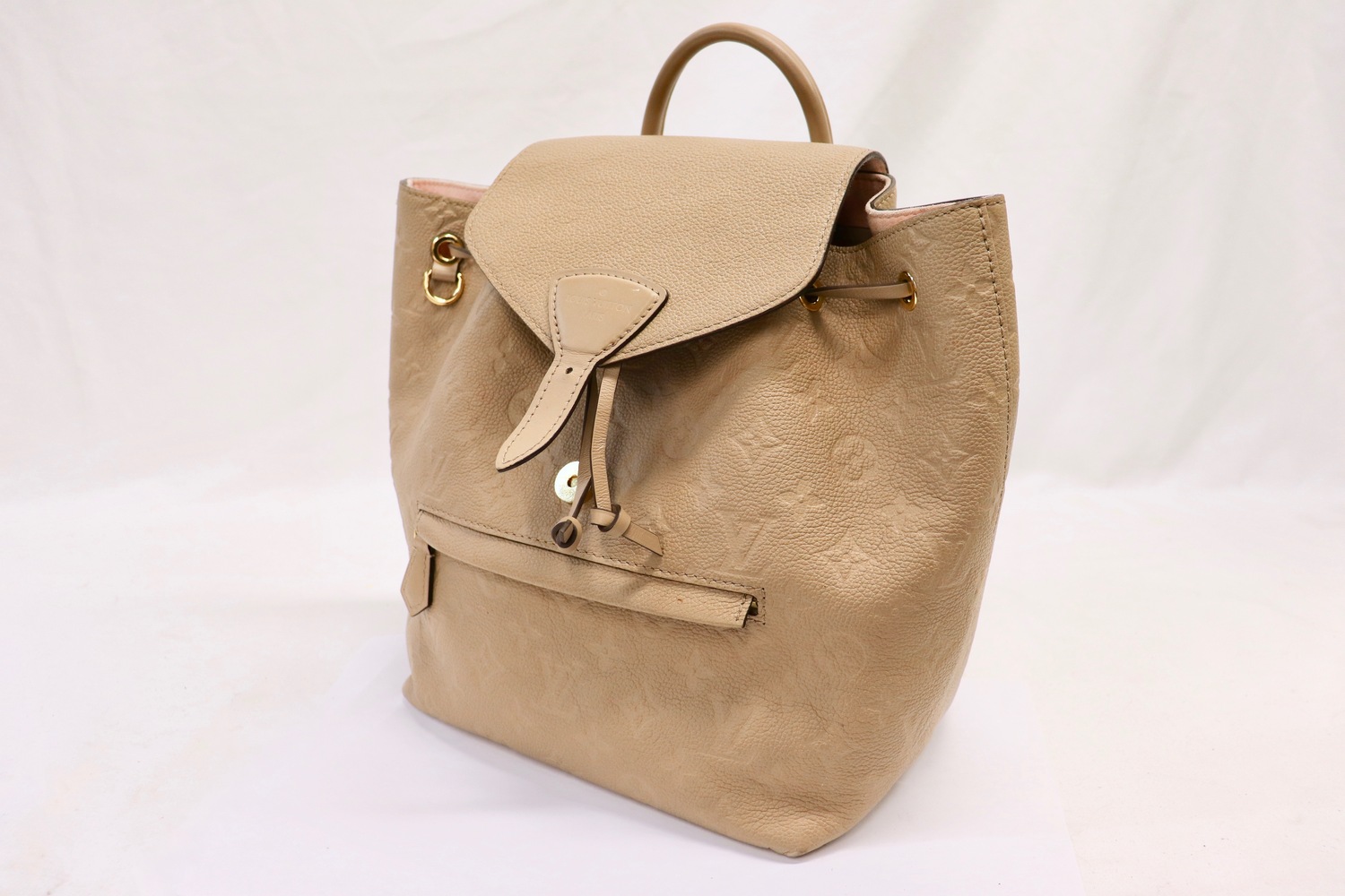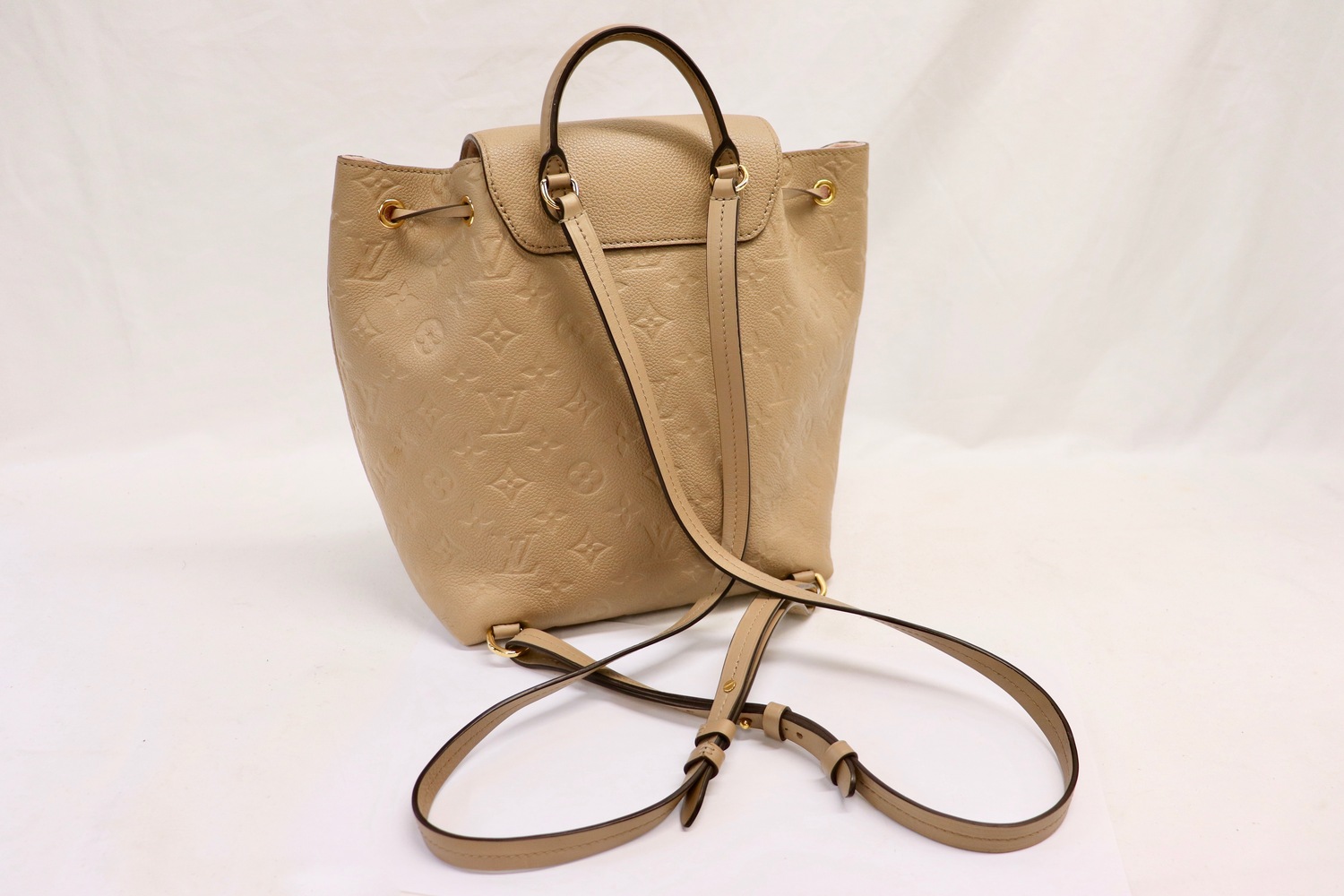 Louis Vuitton Montsouris PM backpack in Beige Monogram Empreinte leather with gold-tone hardware and adjustable twin backpack straps. Classic LV backpack silhouette with flap + drawstring top and a front zip pocket for quick-grab essentials.