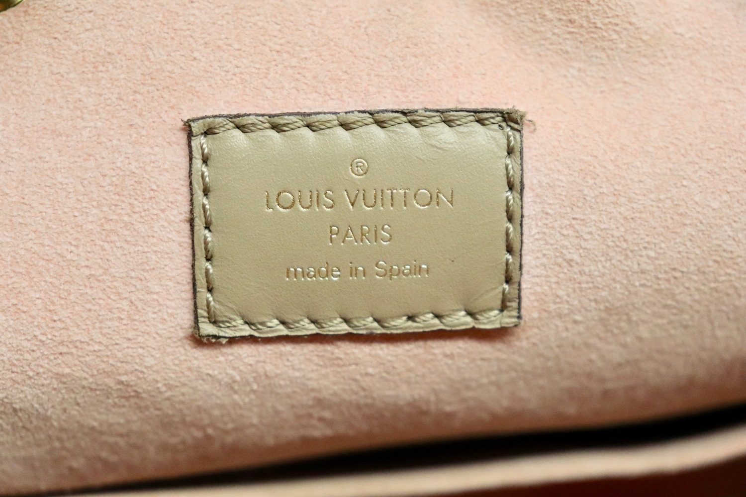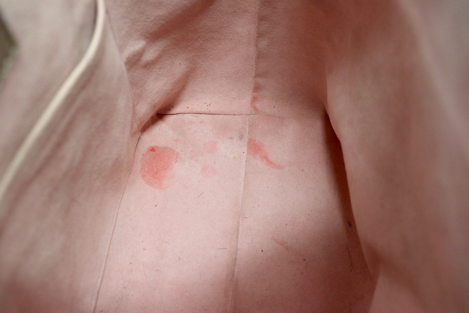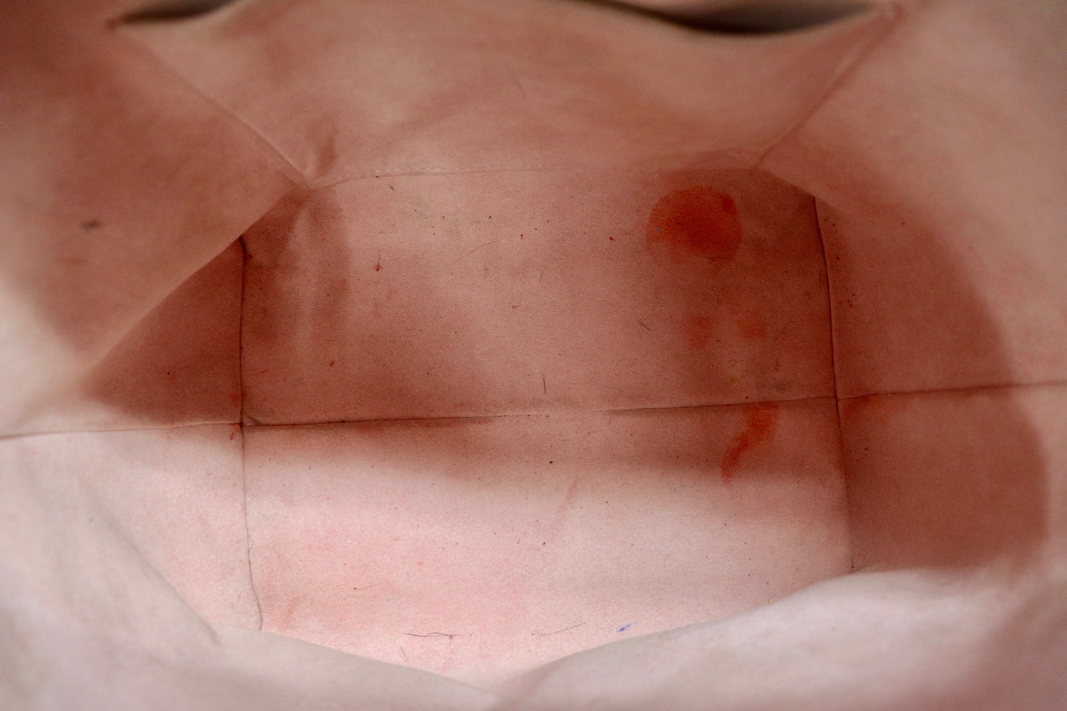 • Interior (pink microfiber): spotting/makeup staining plus minor dust/debris (see photos)