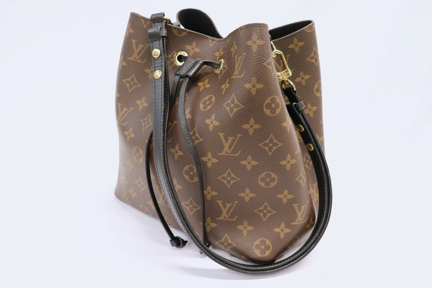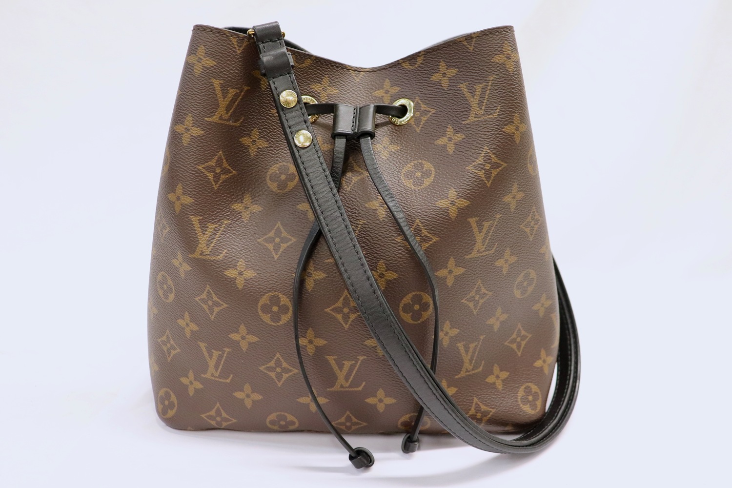 Louis Vuitton Monogram Neo Noé bucket bag crafted in iconic LV monogram coated canvas with black leather trim. This modern take on a classic design features an adjustable and expandable shoulder/crossbody strap and signature drawstring cinch closure.