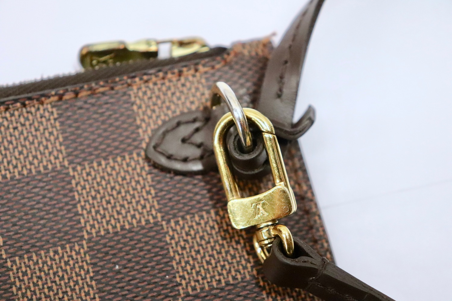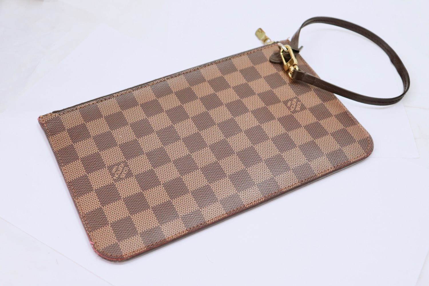 The matching Damier Ebene pouch is included and shows moderate cosmetic wear consistent with use.