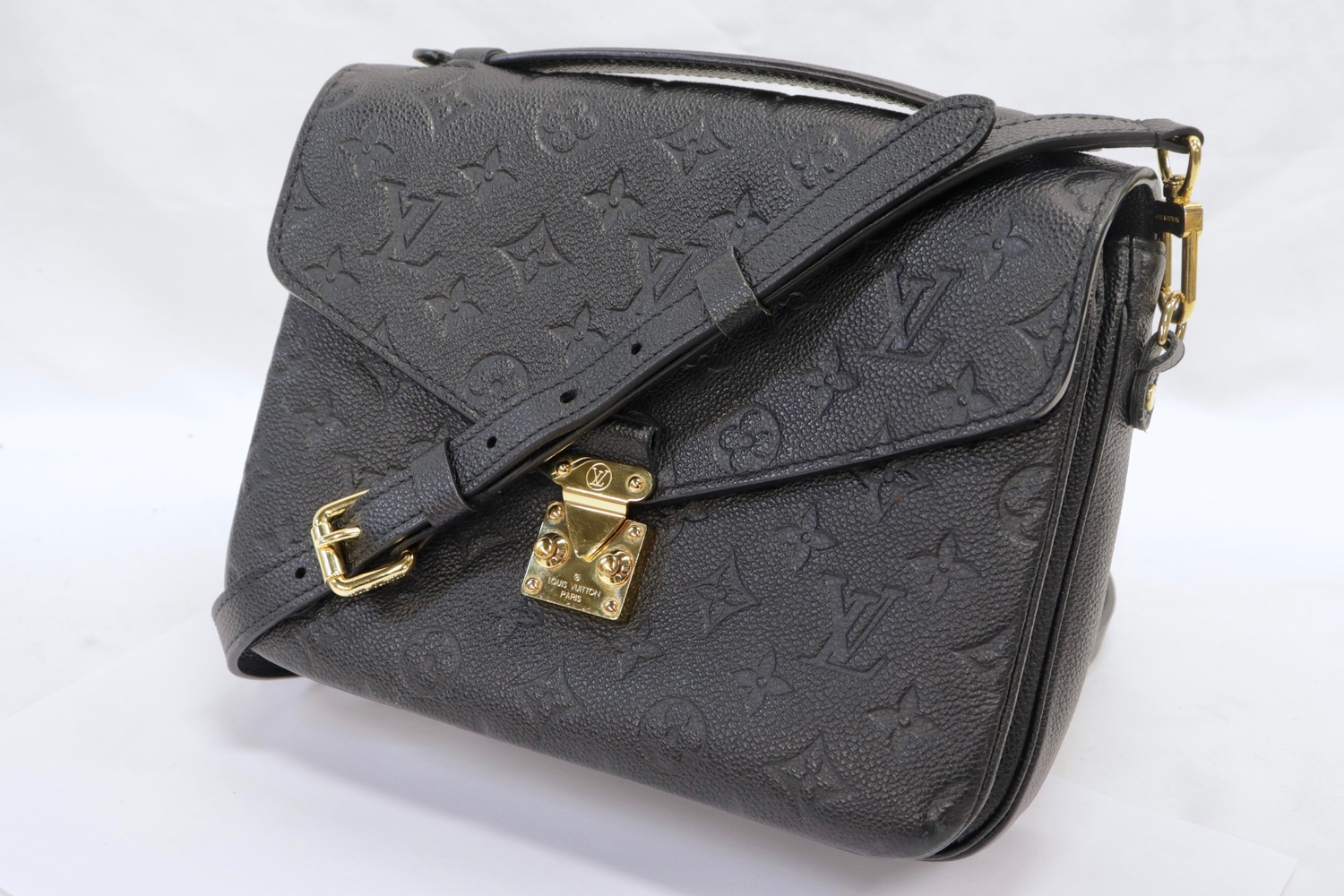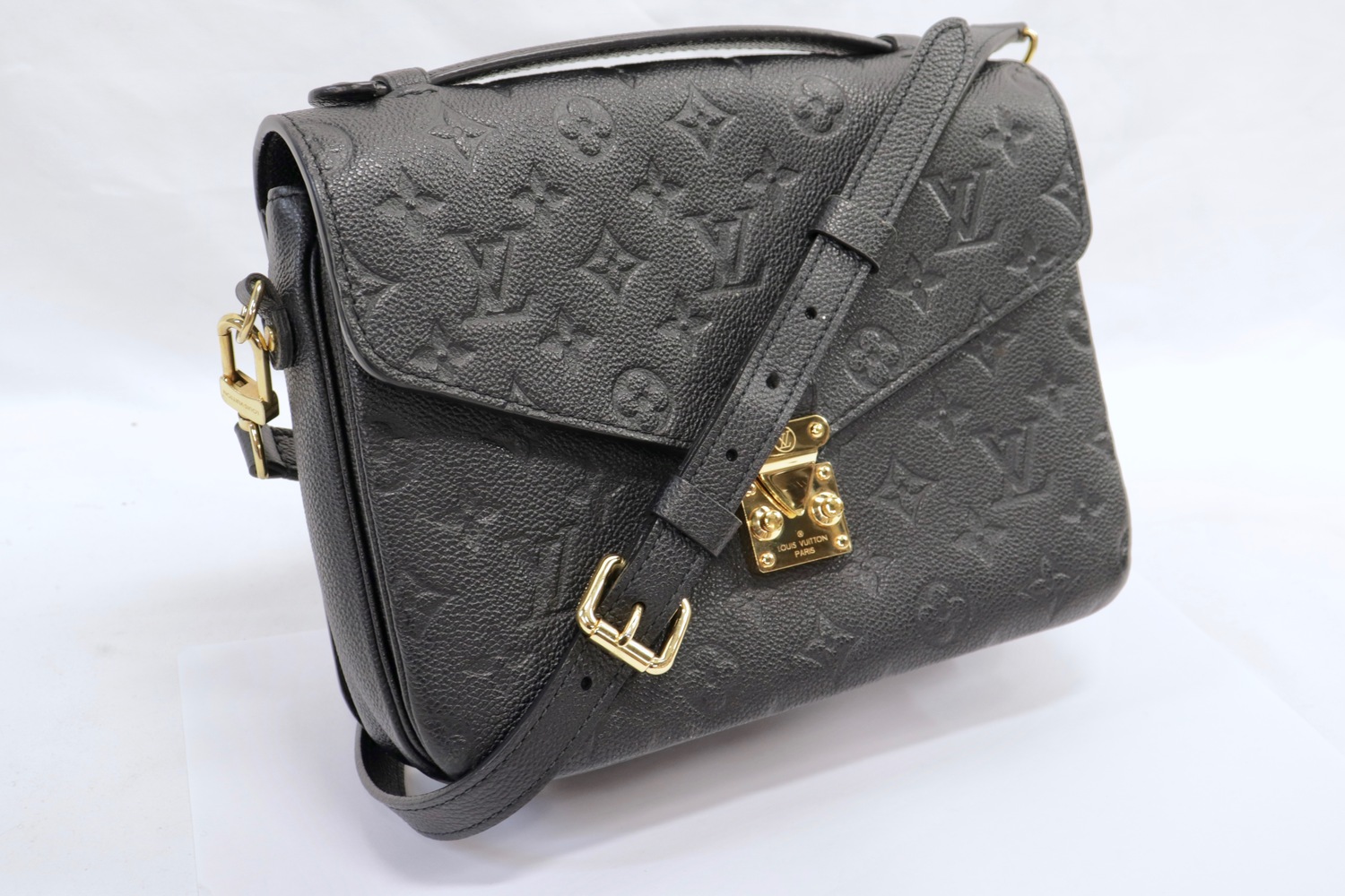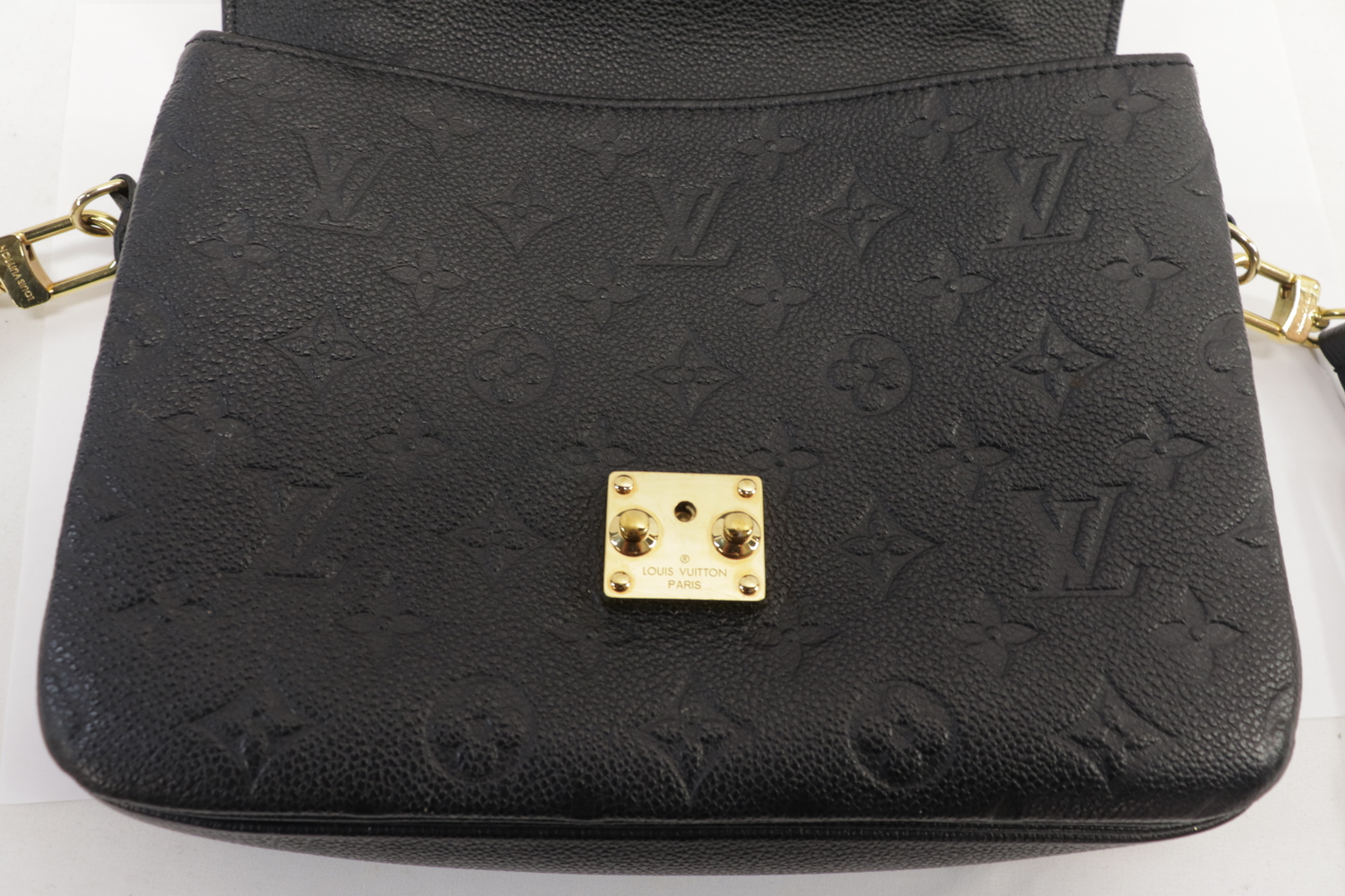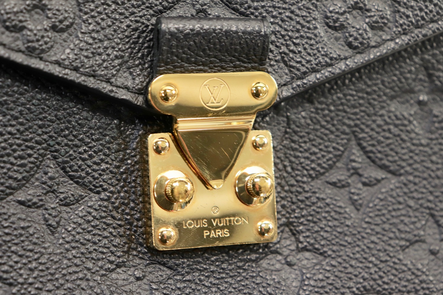 Authentic Louis Vuitton Pochette Métis in Black Empreinte Supple Grained Cowhide Leather (Model M41487). This iconic LV crossbody features the signature monogram-embossed leather, gold-tone S-lock clasp, elegant top handle, and a fully adjustable + removable crossbody strap.