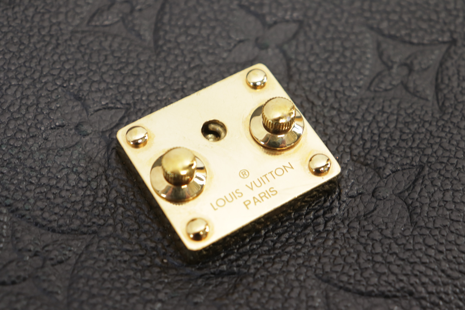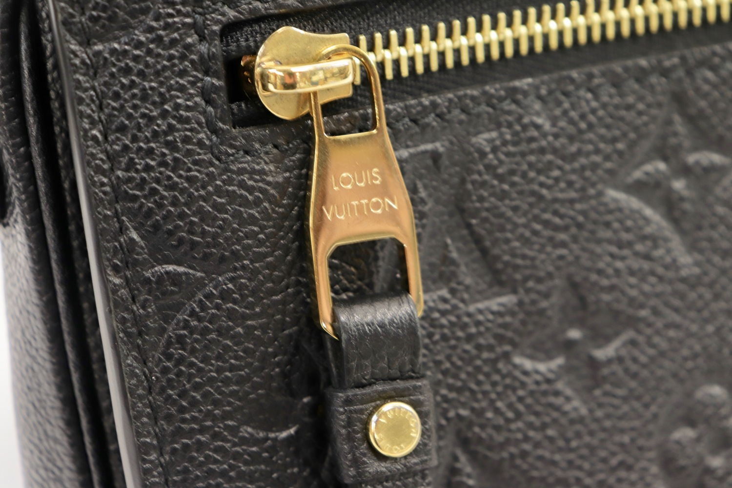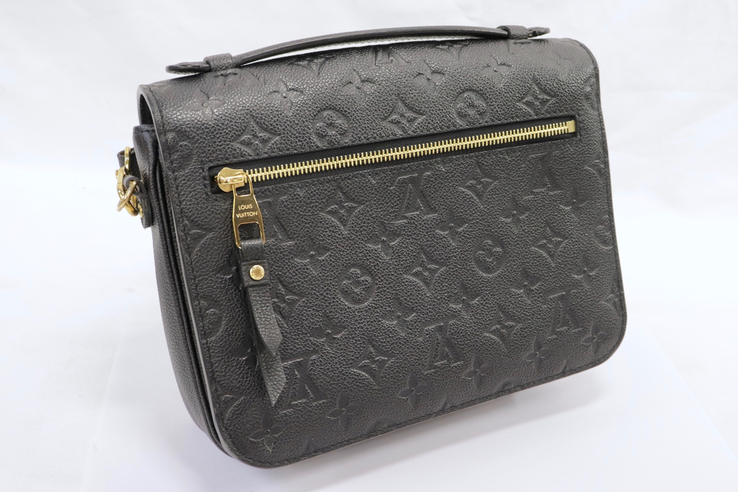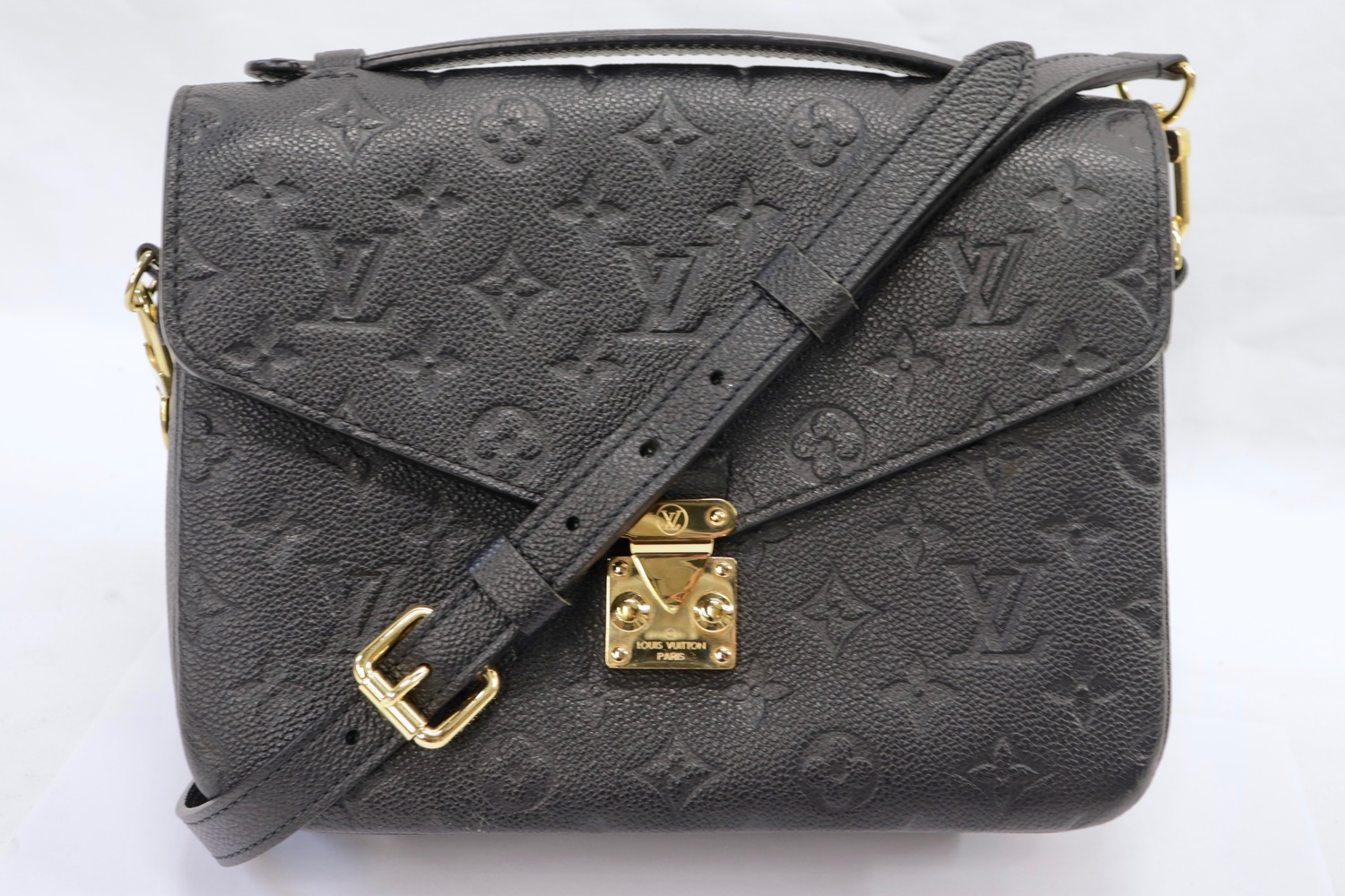 Authentic Louis Vuitton Pochette Métis in Black Empreinte Supple Grained Cowhide Leather (Model M41487). This iconic LV crossbody features the signature monogram-embossed leather, gold-tone S-lock clasp, elegant top handle, and a fully adjustable + removable crossbody strap.