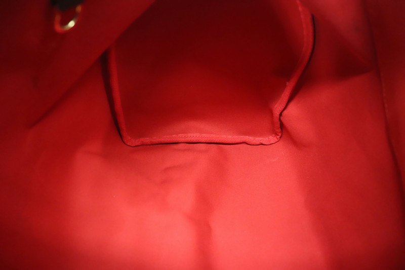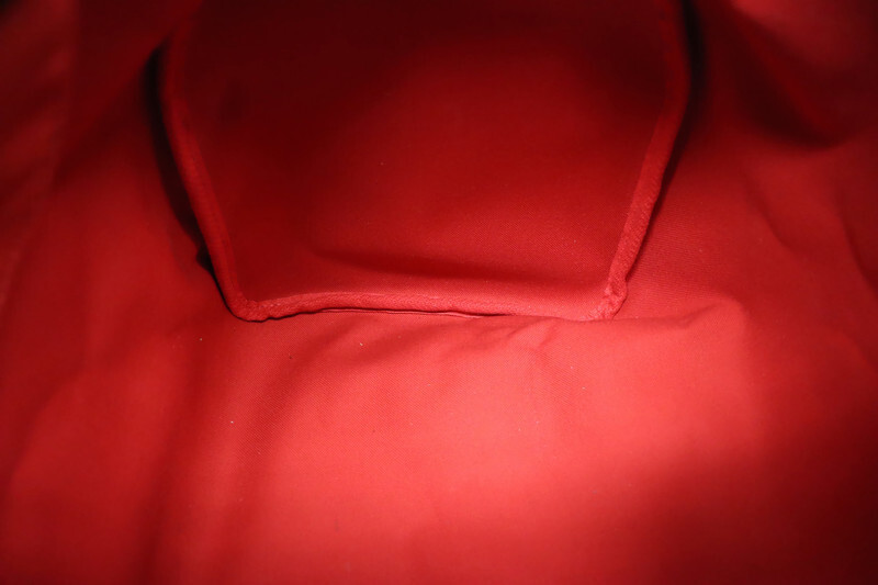 This particular piece is in excellent pre-owned condition, showing no apparent exterior wear. The handles and trim are supple and rich in tone, free of scuffs or dryness. The gold-tone hardware shines beautifully, with only the padlock showing mild tarnish (slightly dulled compared to the rest of the hardware). The red textile interior is clean, odor-free, and without stains or spotting.