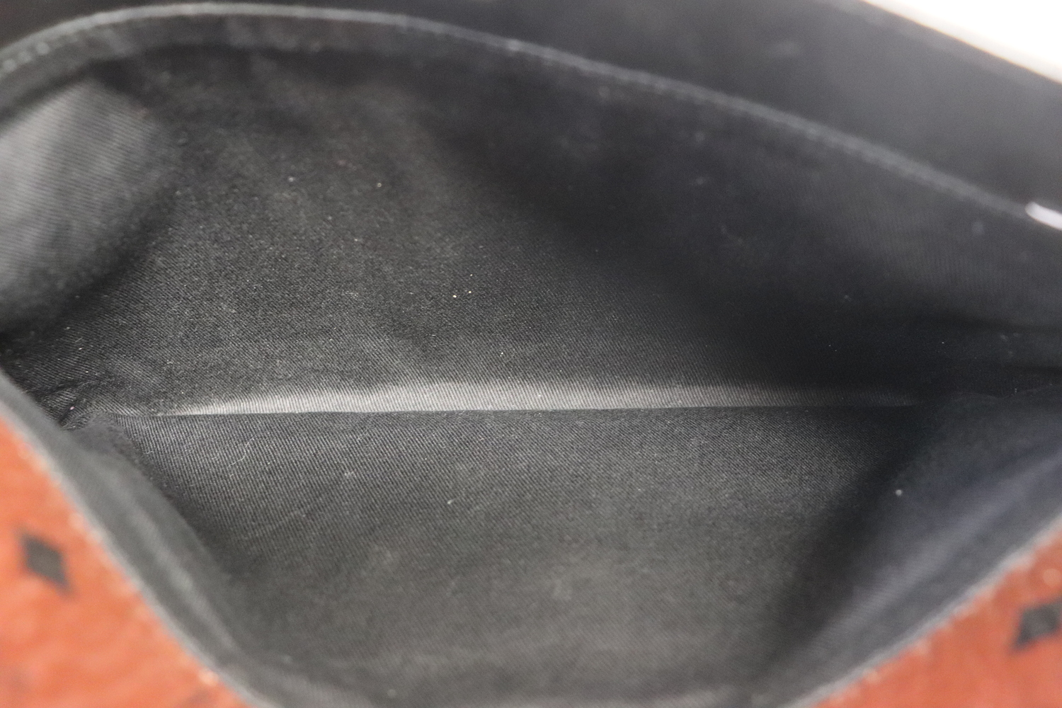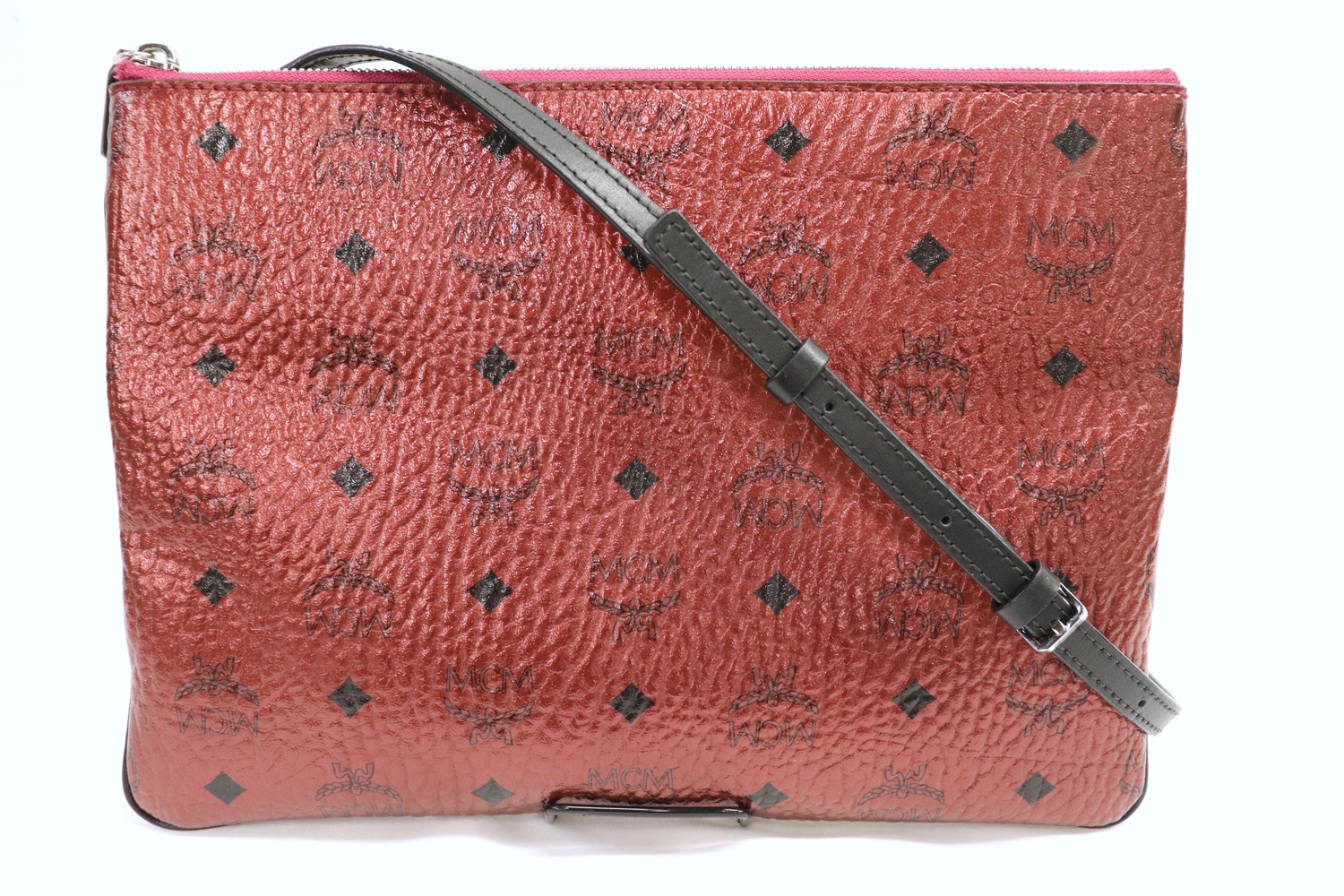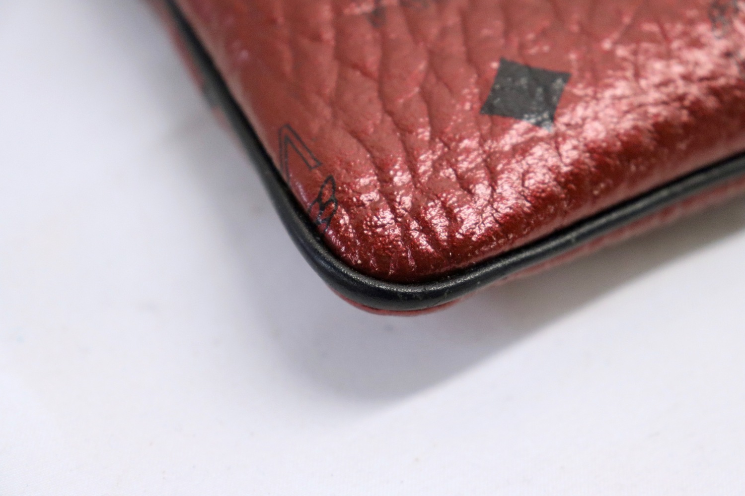This MCM Medium Visetos Crossbody Pouch in metallic red brings that “luxury gift but also extremely practical” vibe. It’s sleek, statement-y, and surprisingly roomy for a flat pouch. Exterior is crisp and clean with no visible wear. Interior does show some spotting and minor dust/debris collection, but no odors, and nothing that affects use.