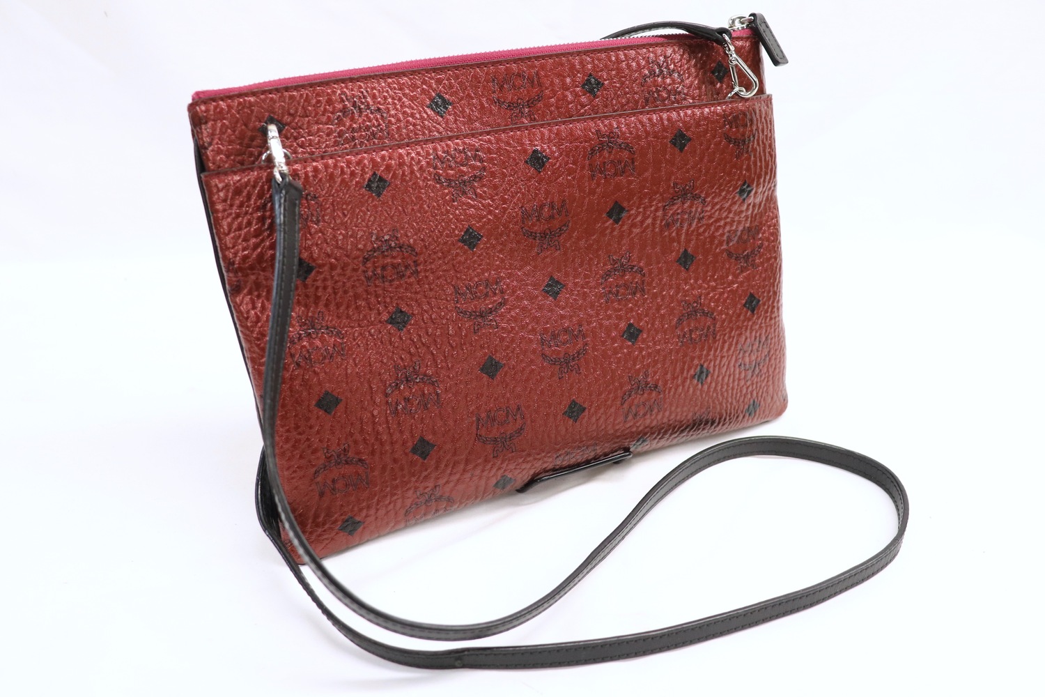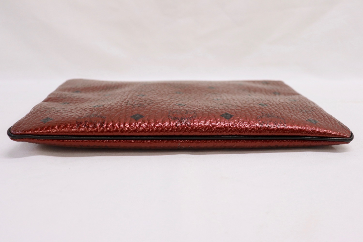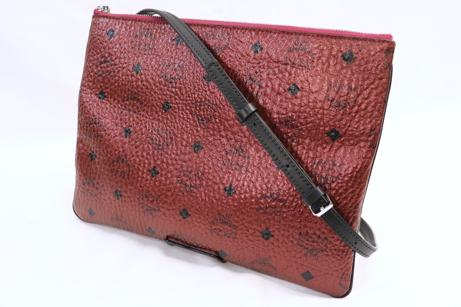 This MCM Medium Visetos Crossbody Pouch in metallic red brings that “luxury gift but also extremely practical” vibe. It’s sleek, statement-y, and surprisingly roomy for a flat pouch. Exterior is crisp and clean with no visible wear. Interior does show some spotting and minor dust/debris collection, but no odors, and nothing that affects use.