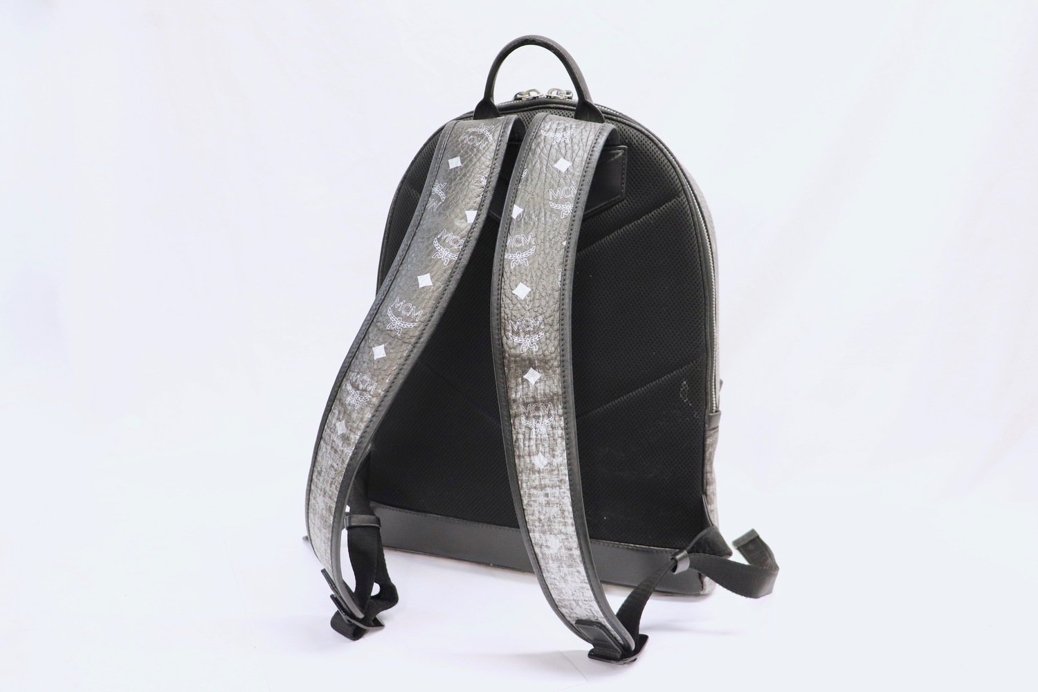 Authentic MCM Visetos Ombré Backpack in black/gray gradation with silver-tone hardware and classic monogram print. Sleek, structured, and practical with multiple compartments including a dedicated laptop sleeve- perfect everyday luxury carry.