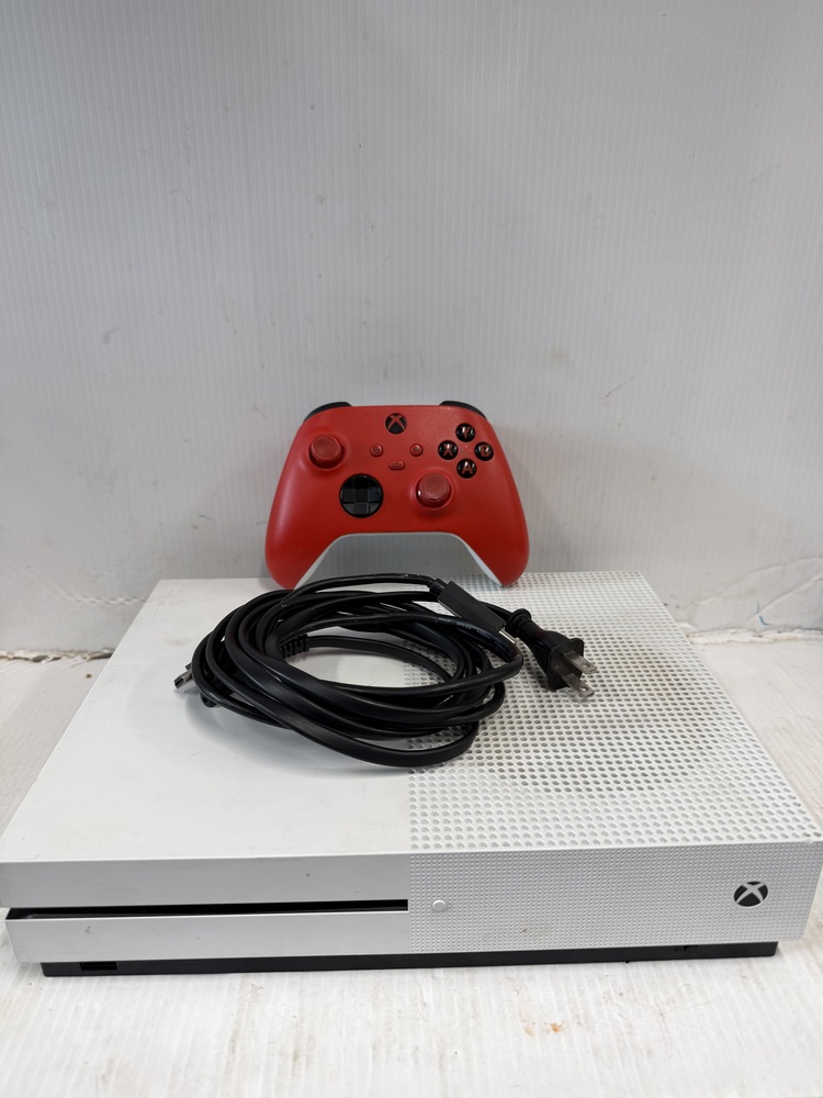 Microsoft Xbox One S console in white, tested and working properly. This system is great for gaming, streaming, and entertainment. Includes a red Xbox wireless controller and power cable, making it ready to play right out of the box.
