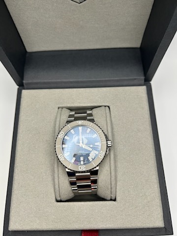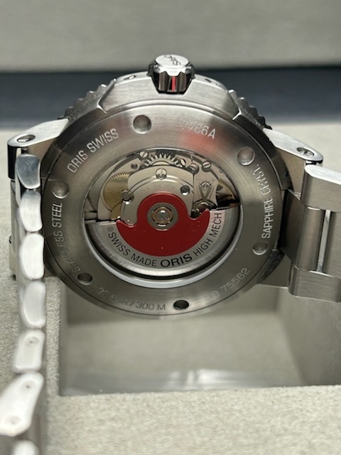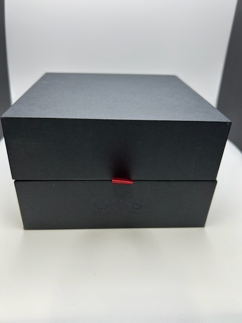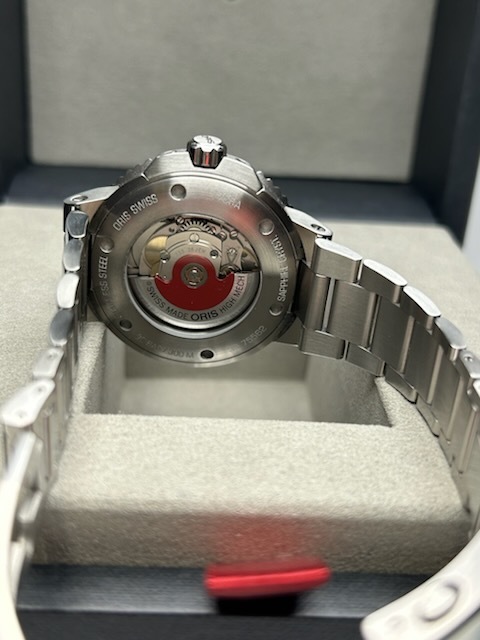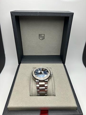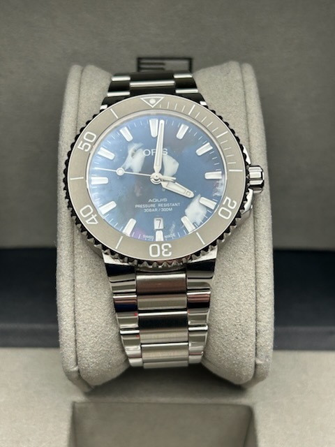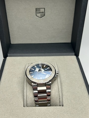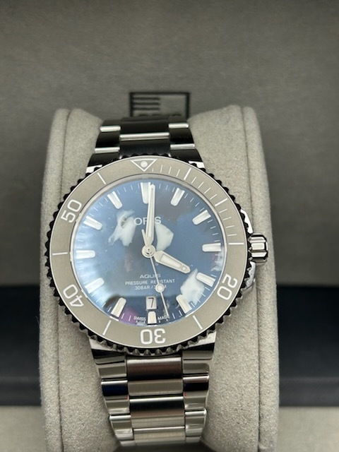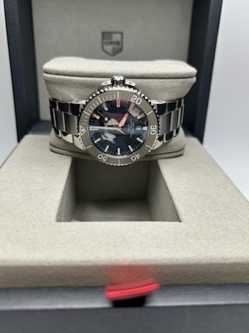 The Oris Aquis Upcycle 41.5mm features a unique dial made from recycled ocean plastics. Housed in a stainless steel case, it's water-resistant to 300m, perfect for diving. Comes in a presentation box, highlighting Oris' environmental initiative. Availability is limited.