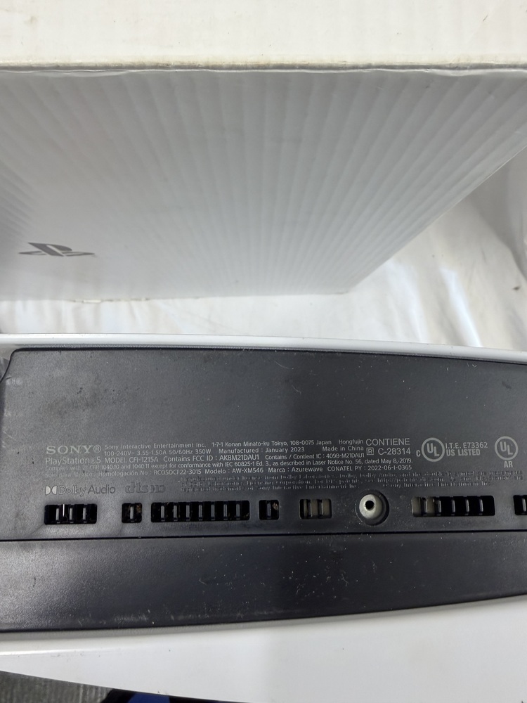 This listing is for a Sony PlayStation 5 Disc Edition console bundle. Includes the console, a DualSense wireless controller, power/HDMI cables, and the original box. System shows some cosmetic wear but is fully functional and ready for use.