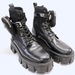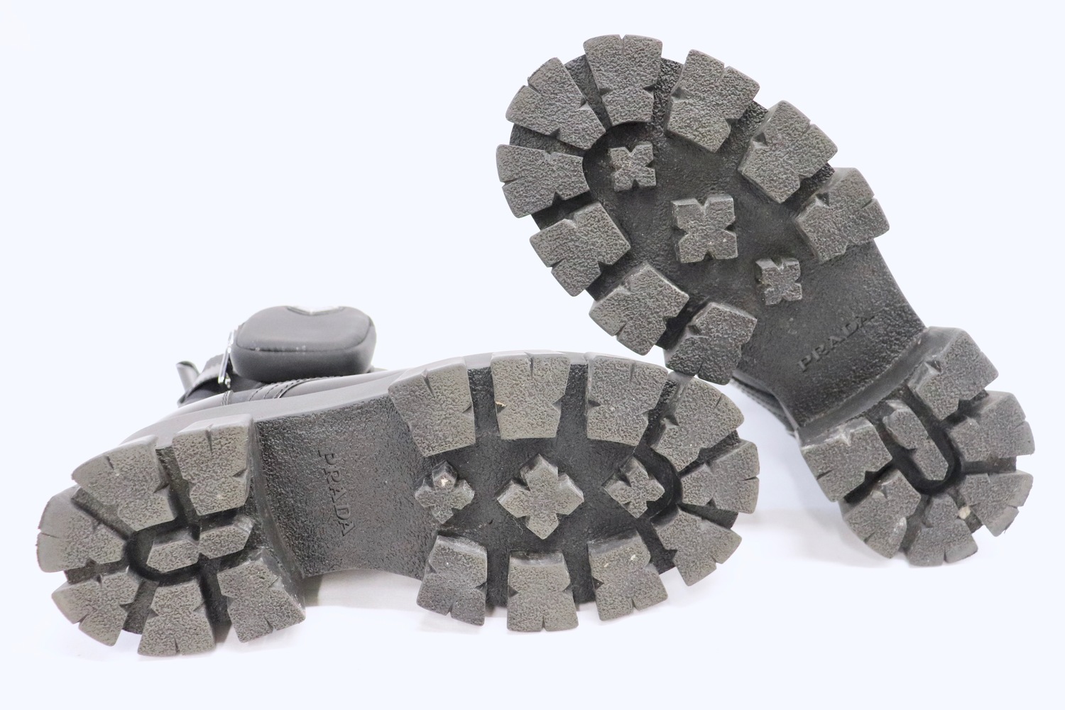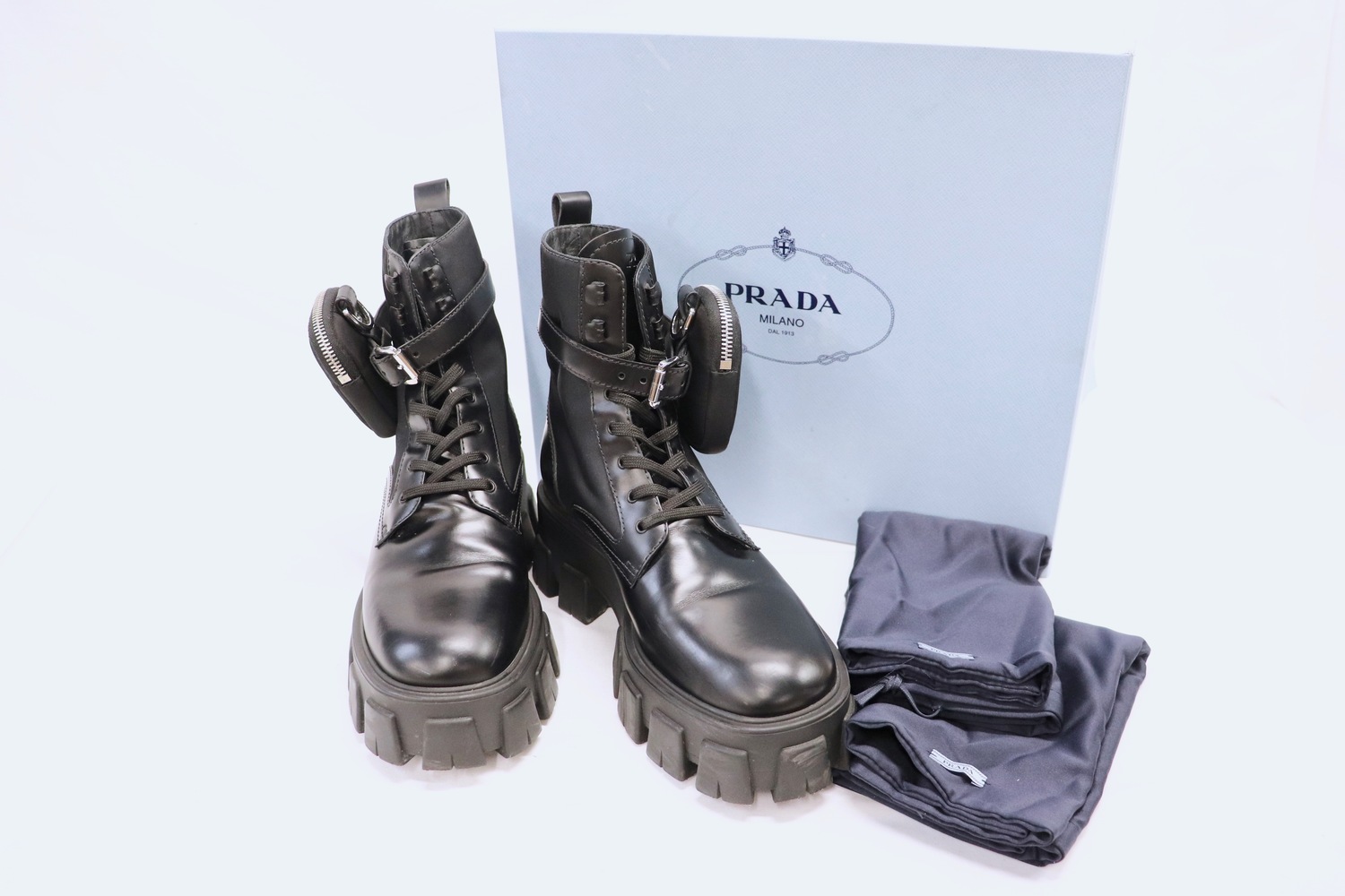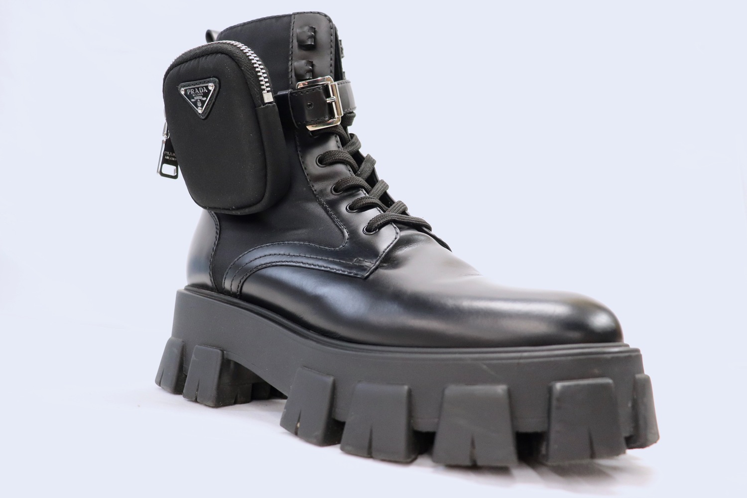 Statement-making PRADA Monolith combat boots featuring the iconic dual removable ankle pouches. Crafted in Italy from smooth black leather with durable nylon panels, these boots deliver Prada’s signature utility-meets-luxury aesthetic. Chunky lug soles, mixed closures, and bold proportions make these a standout pair for elevated streetwear or avant-garde styling.