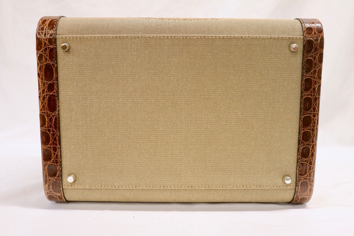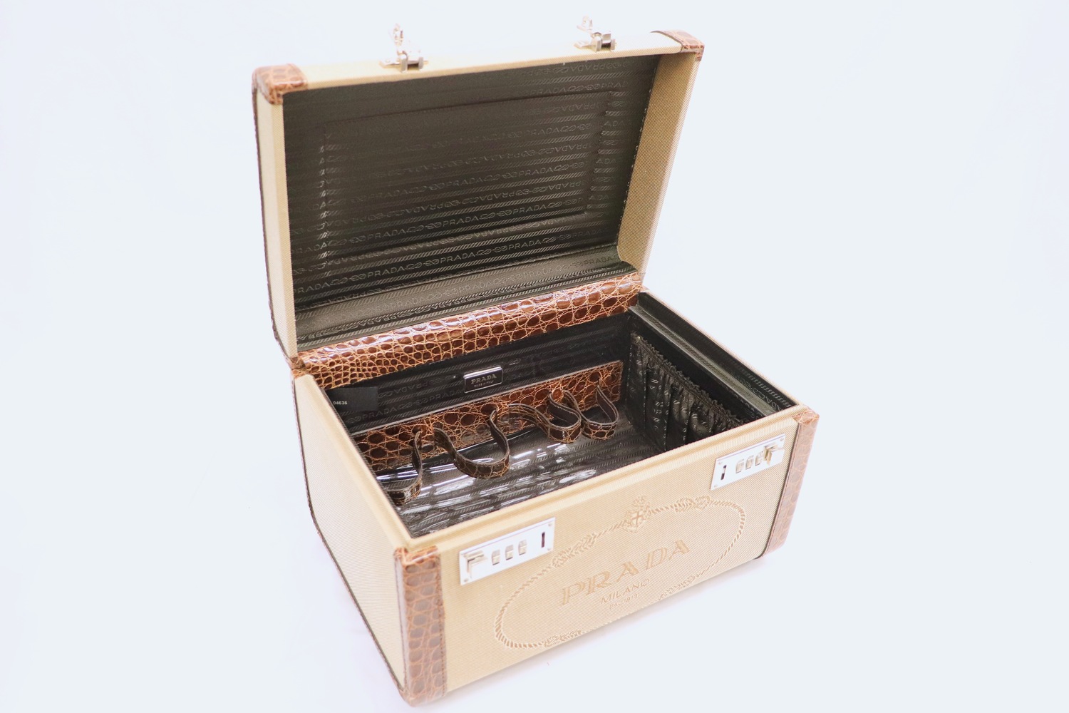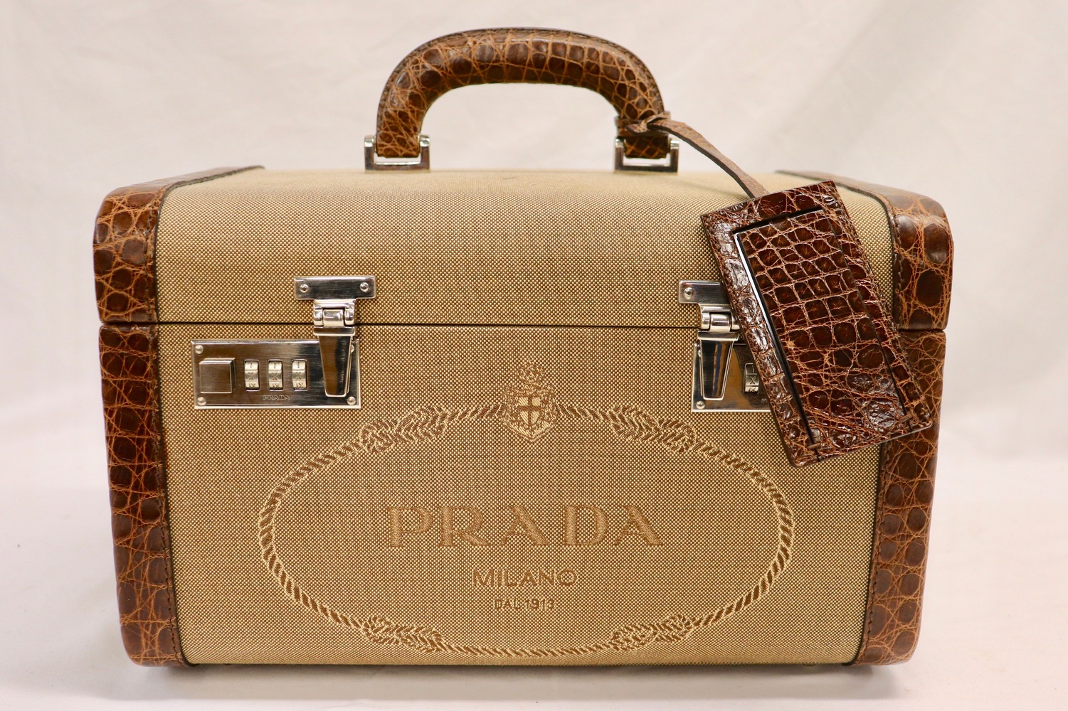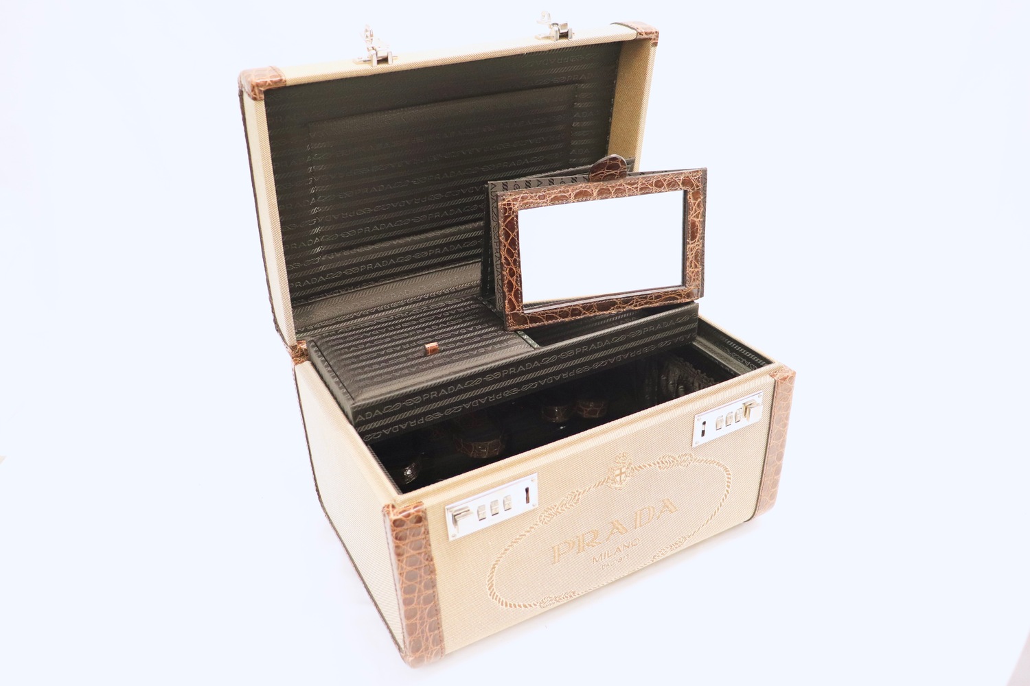 Exceptional Prada train/travel case from the Viaggio Logo line, finished in durable corda canvas with rich tobacco croc-embossed leather trim. A beautifully structured luxury travel piece designed for organized packing, featuring a removable dual-compartment tray, mirror, and easy-clean plastic-lined base.