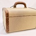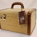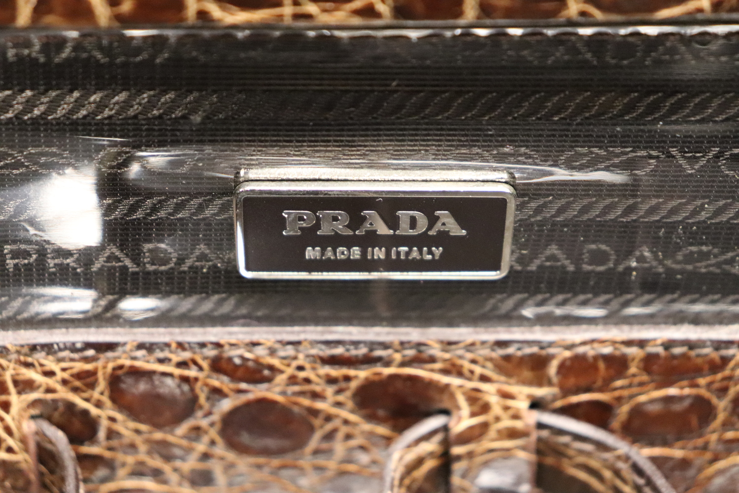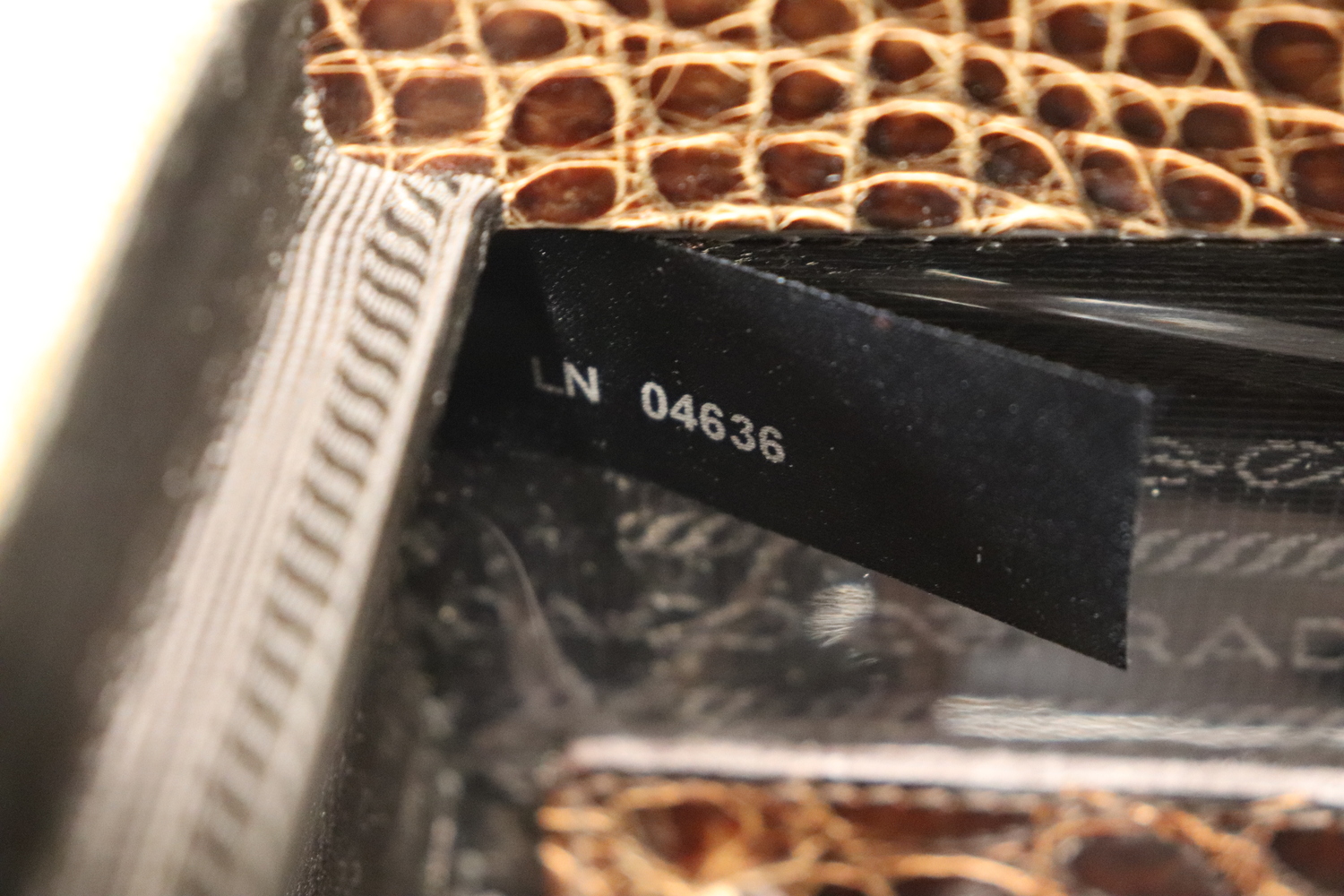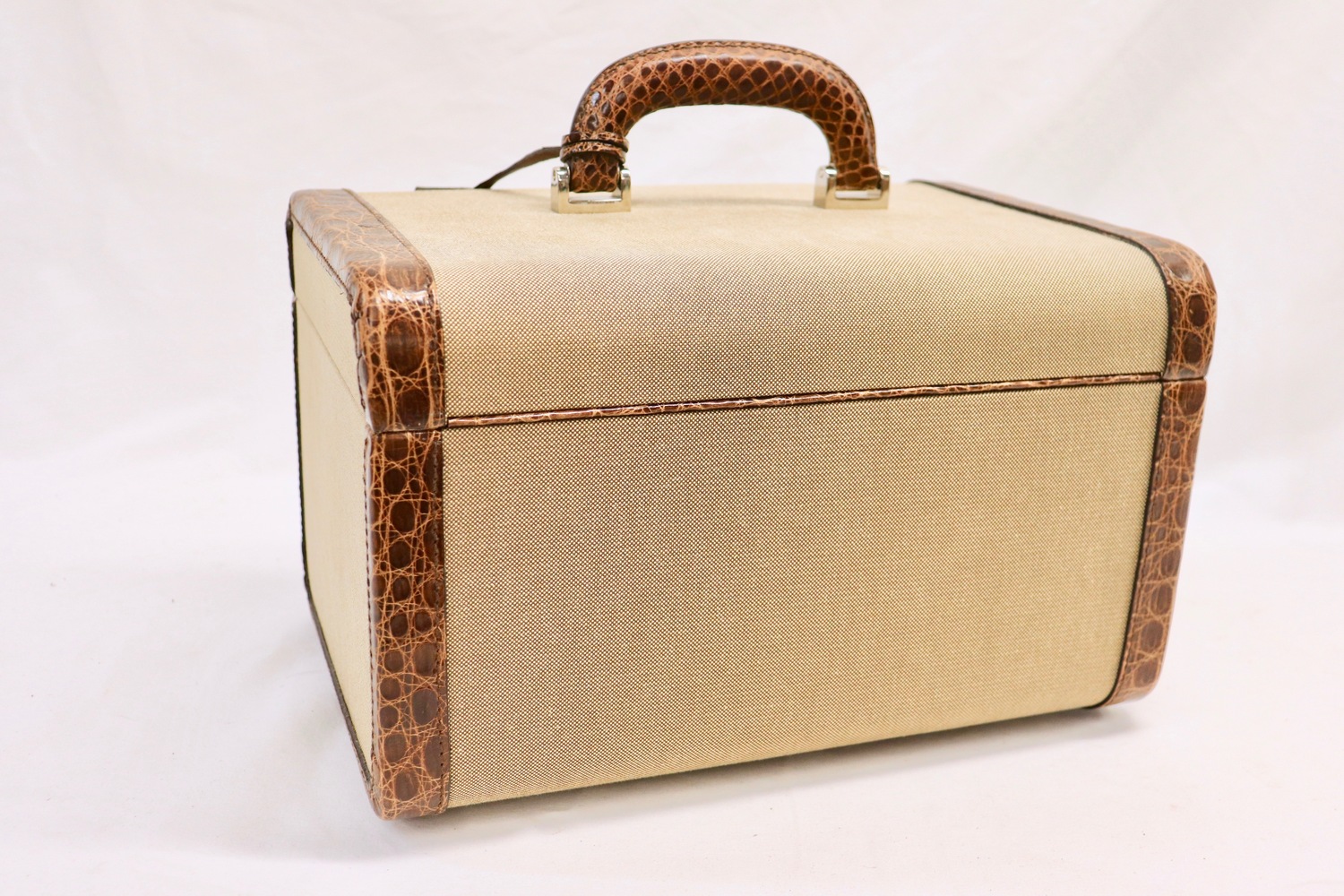 Exceptional Prada train/travel case from the Viaggio Logo line, finished in durable corda canvas with rich tobacco croc-embossed leather trim. A beautifully structured luxury travel piece designed for organized packing, featuring a removable dual-compartment tray, mirror, and easy-clean plastic-lined base.
