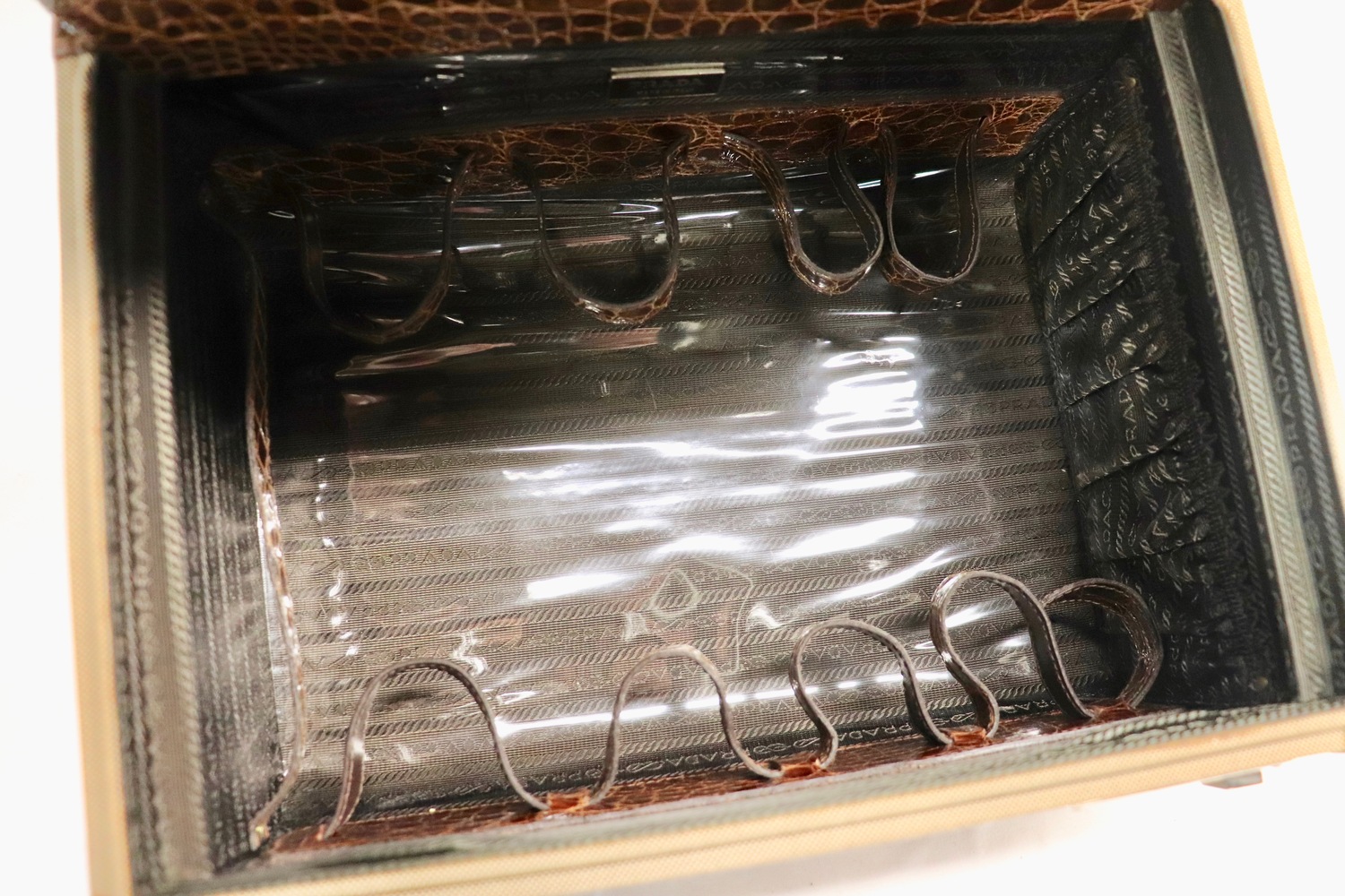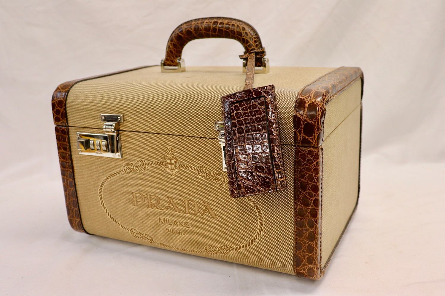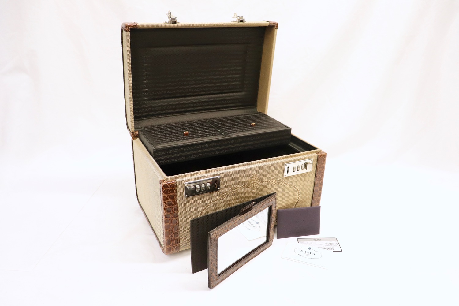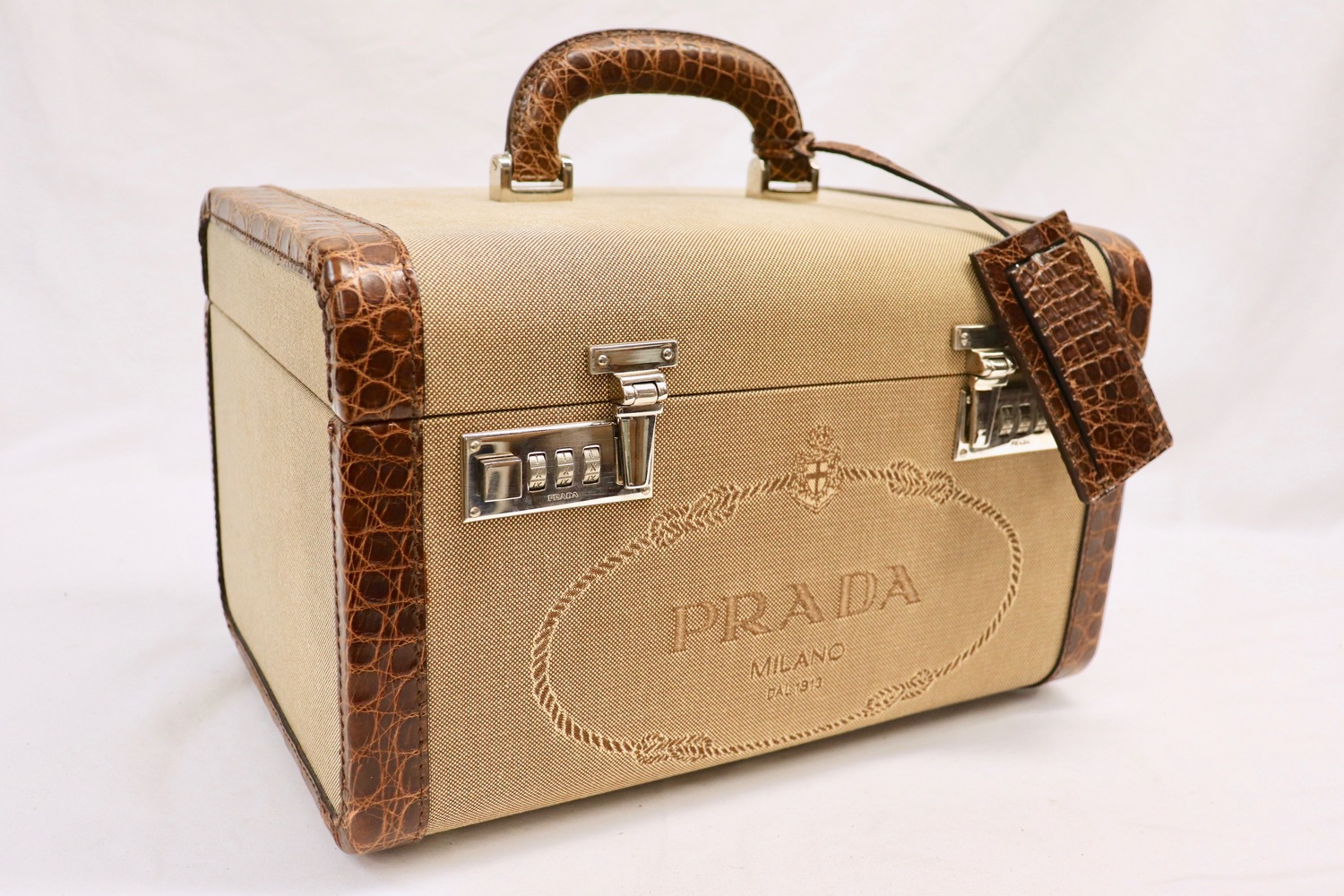Exceptional Prada train/travel case from the Viaggio Logo line, finished in durable corda canvas with rich tobacco croc-embossed leather trim. A beautifully structured luxury travel piece designed for organized packing, featuring a removable dual-compartment tray, mirror, and easy-clean plastic-lined base.