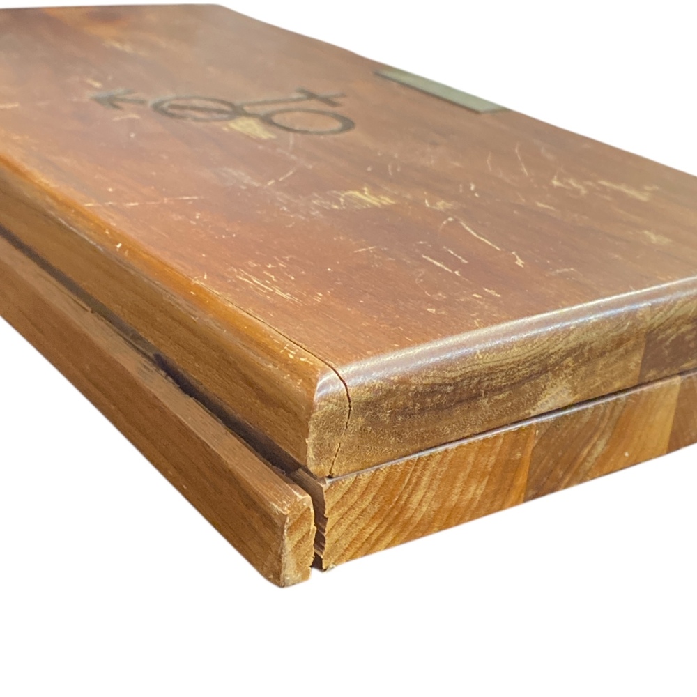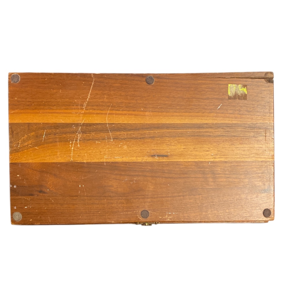 The wooden box is in good overall condition but shows notable wear. There is a visible crack on one corner of the wood, and one hinge is missing. The box remains intact and functional, with cosmetic and hardware wear consistent with age and handling. All condition issues are shown in the photos.