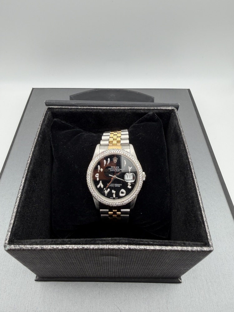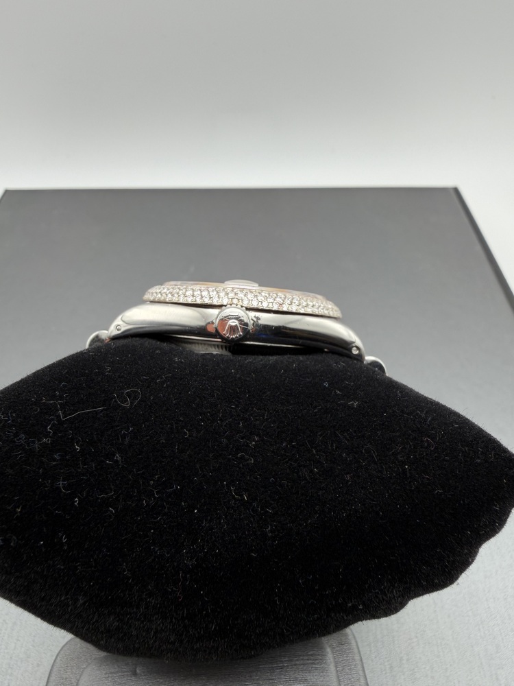 Diamonds on the dial and/or bezel appear to be aftermarket/custom (not factory Rolex). Watch is priced accordingly.