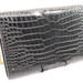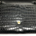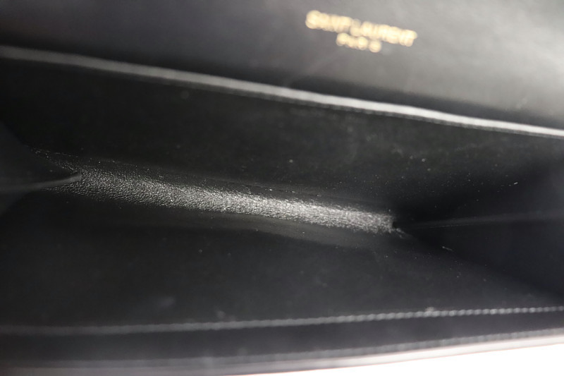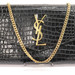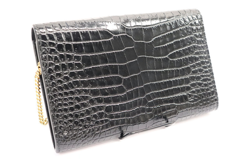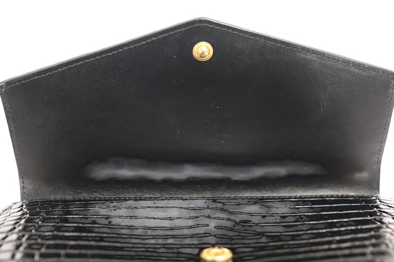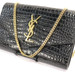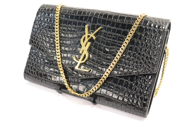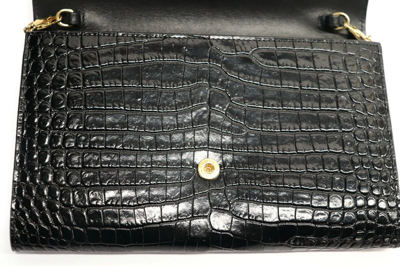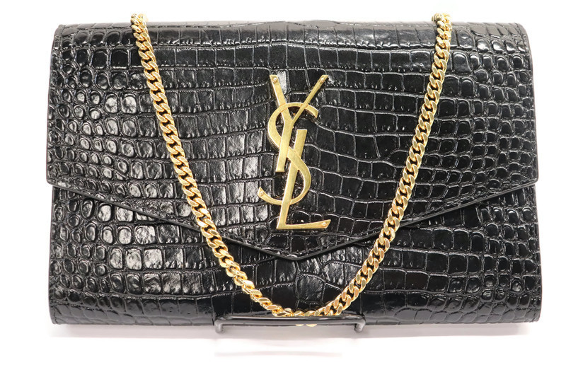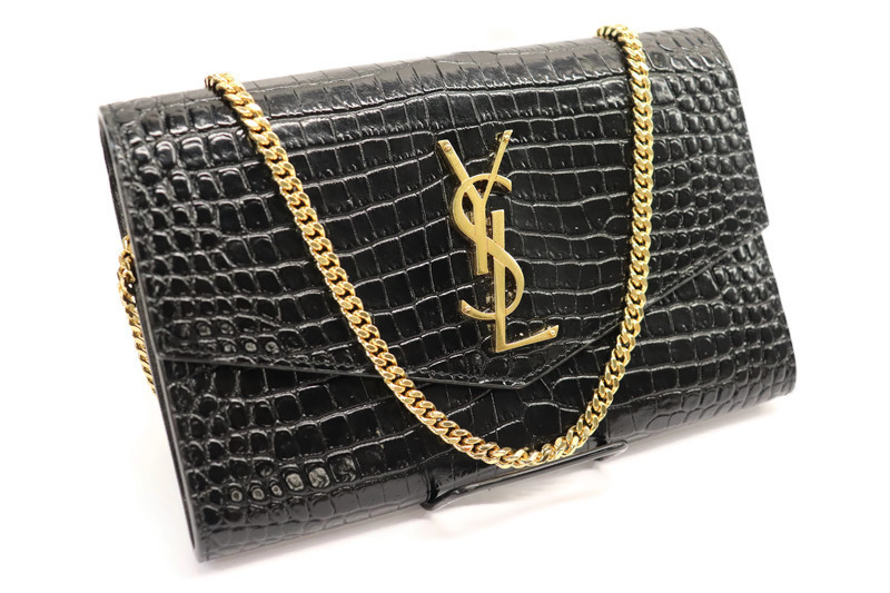 Timeless Saint Laurent elegance- sleek black croc-embossed leather with iconic YSL logo.