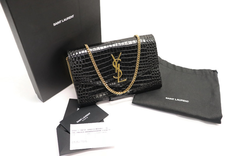 YSL, Saint Laurent, Monogram Pouch, Crossbody Bag, Clutch, Black Croc Embossed Leather, Gold Chain Strap, Designer Handbag, Luxury Purse, Authentic YSL, Evening Bag, French Designer, Paris Fashion