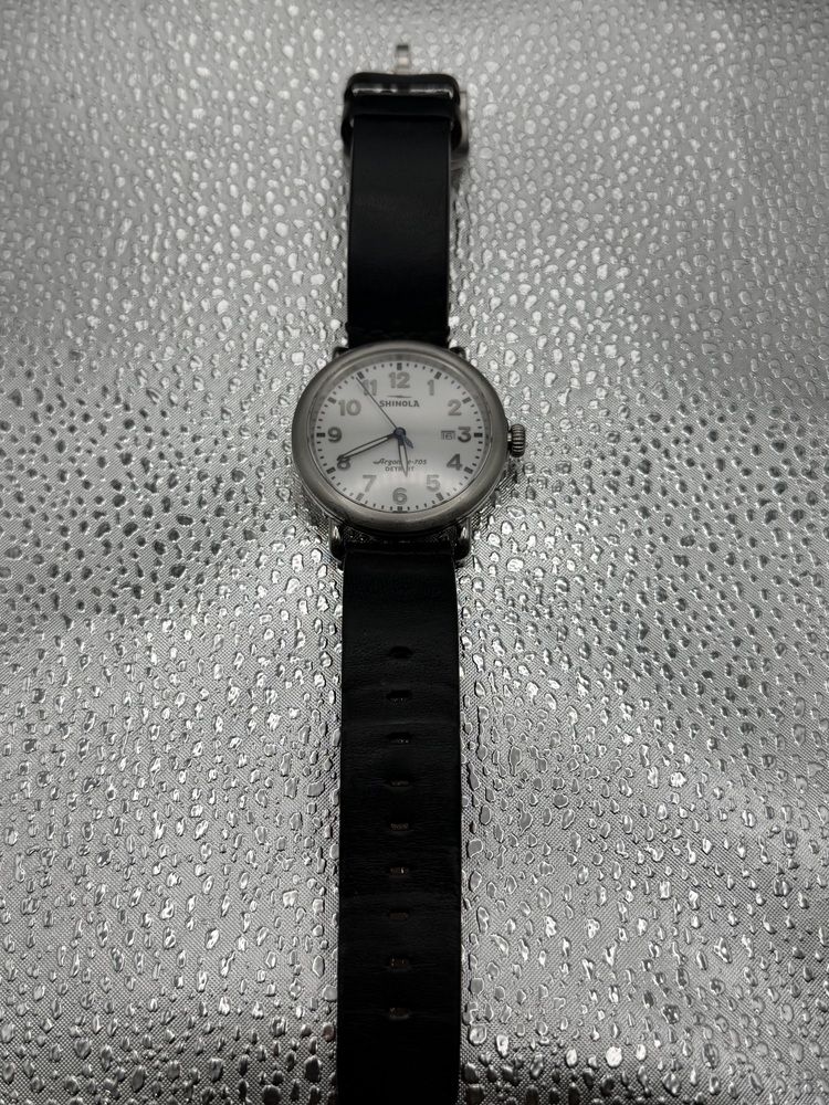 Authentic Shinola wristwatch featuring a clean white dial with bold Arabic numerals and a convenient date window at the 3 o’clock position. Powered by Shinola’s Argonite-705 quartz movement, assembled in Detroit. Finished with a classic black leather strap, this watch offers a timeless, versatile design suitable for everyday wear.