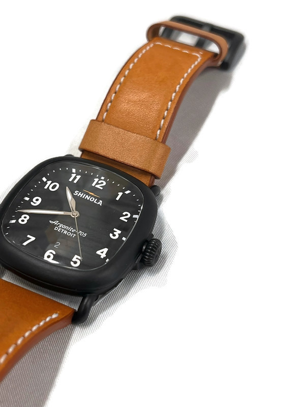 Shinola puts a vintage spin on their classic design with The Guardian watch. Named for the iconic building that sits at 500 Griswold Street in Detroit, The Guardian boasts a strong, handsome design with a 41.5mm cushion shaped stainless steel case and cool grey dial. Powered by a reliable Argonite 705 quartz movement, this watch also features bright Arabic numerals, luminescent hour and minute hands, and a date indicator at 6 o'clock to ensure that you are on time to every business meeting and tee time! A tan leather strap completes the look and ensures the watch stays comfortably secured to your wrist.