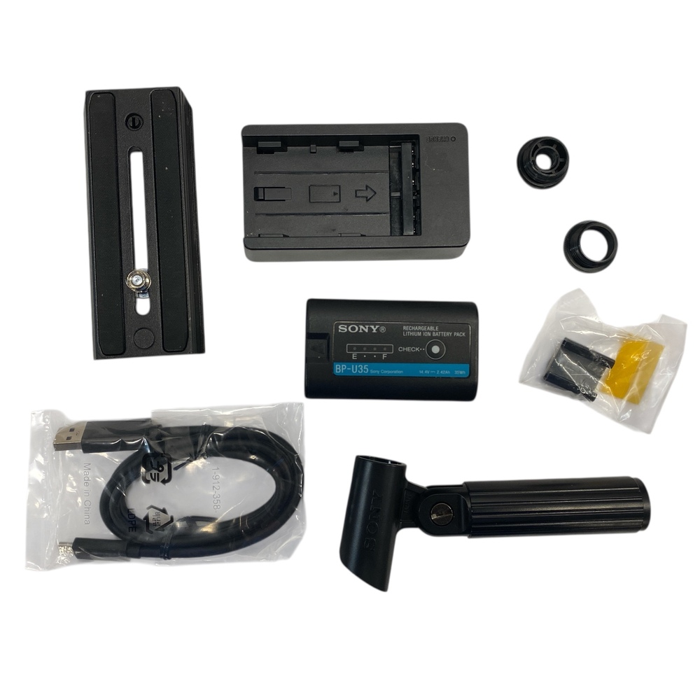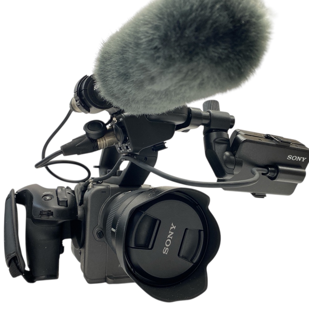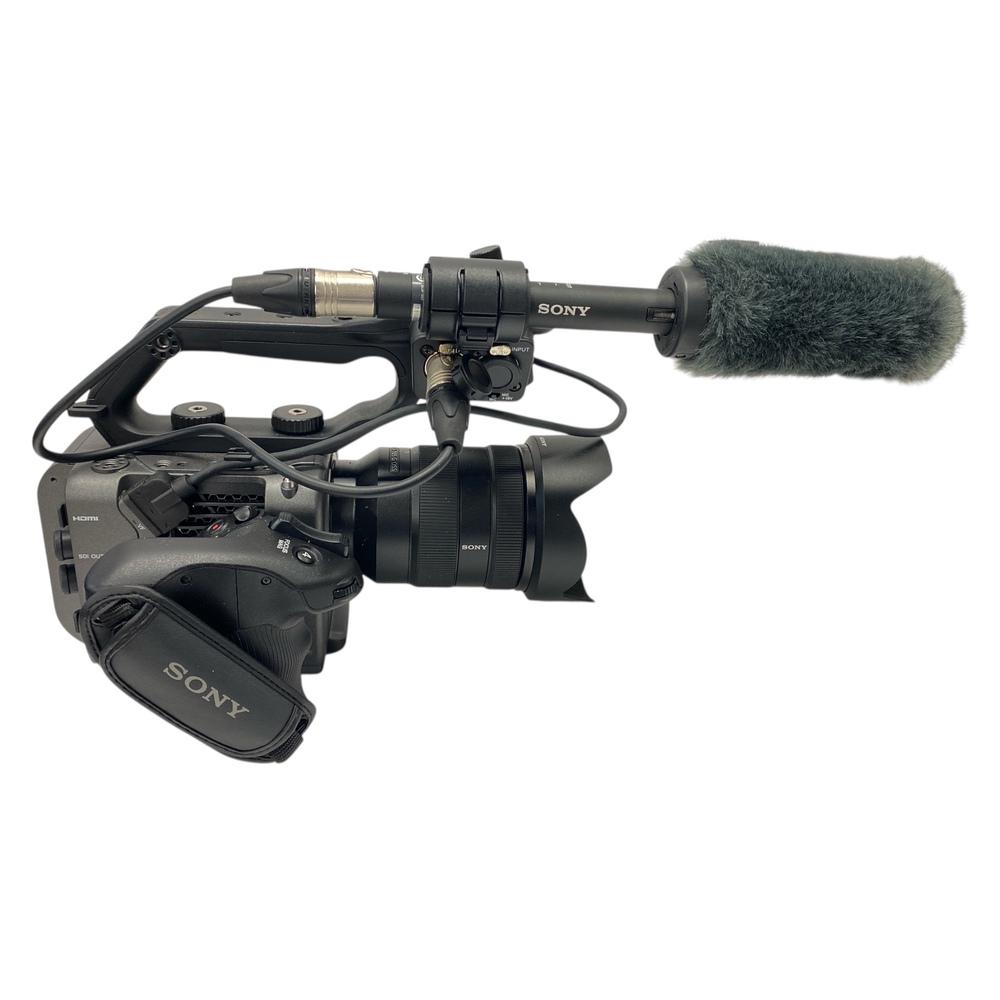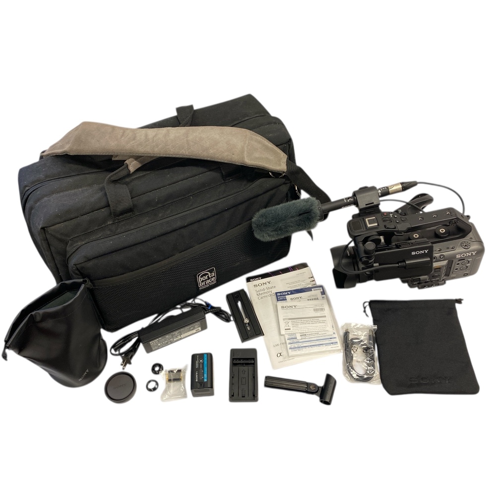 This is a complete shooting kit, including a Sony G-series zoom lens, professional shotgun microphone, battery and charger, power supply, and a Porta Brace camera bag. The camera shows light cosmetic wear consistent with careful professional use.