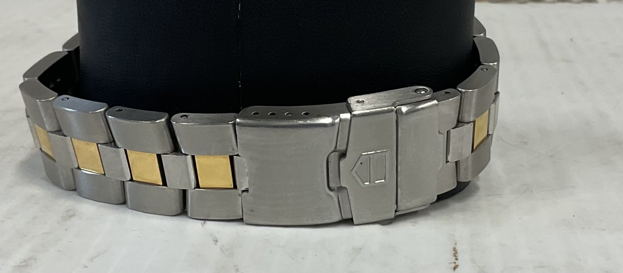 Bracelet: Stainless steel and 18k yellow gold link style bracelet with hidden deployment clasp.