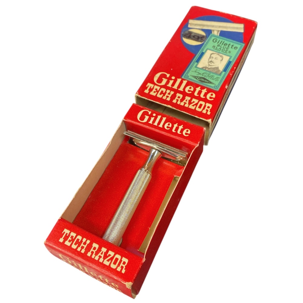 • Gillette Tech Razor: Produced from 1938 into the 1970s, the Tech was one of Gillette’s most enduring safety razor designs, featuring a closed-comb guard for a mild, smooth shave that appealed to a wide audience.