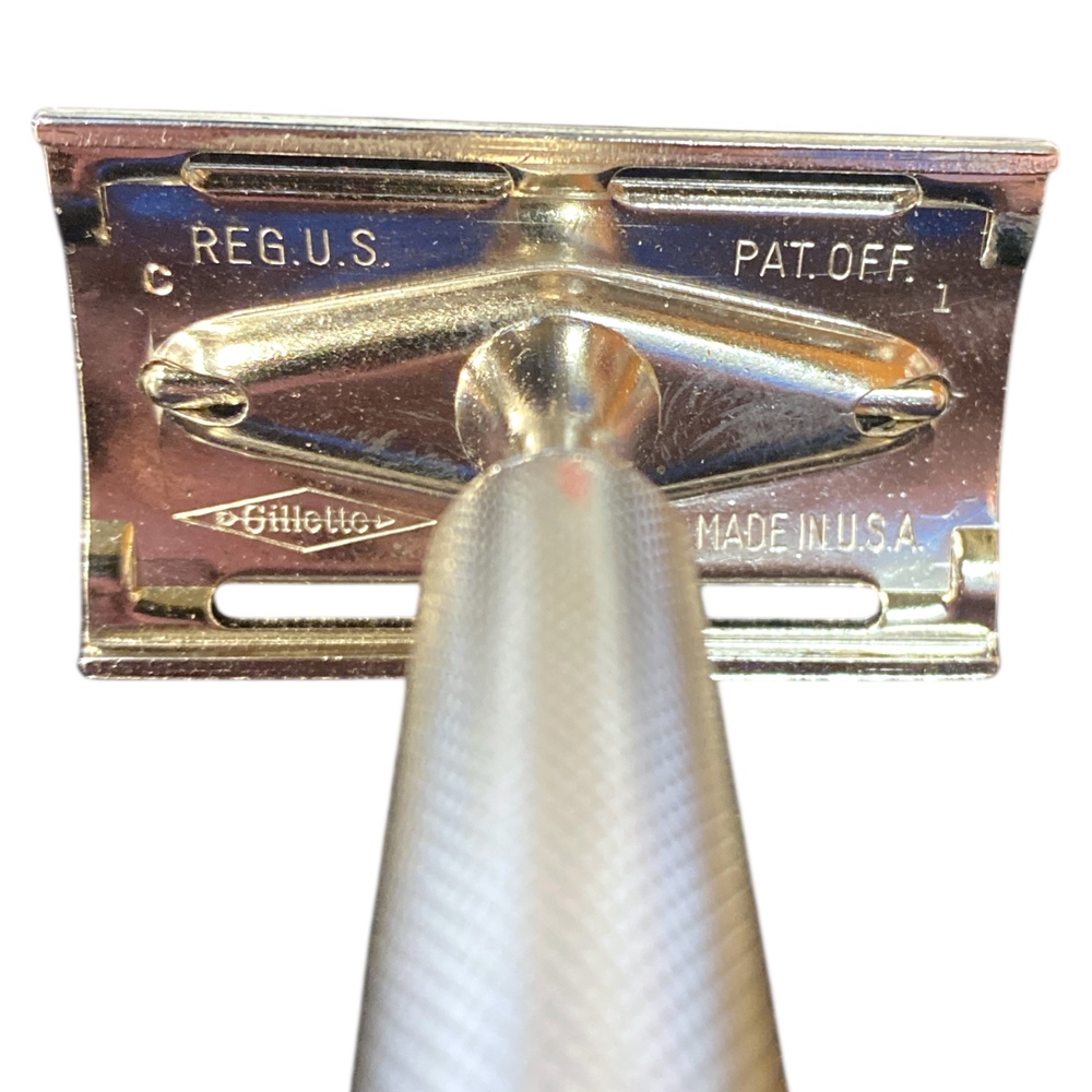The “C1” date code on Gillette blades often dates them to 1957, denoting era and authenticity of the blade packaging style. Vintage Gillette Thin blades are distinguished by their elegant typography and classic branding.
