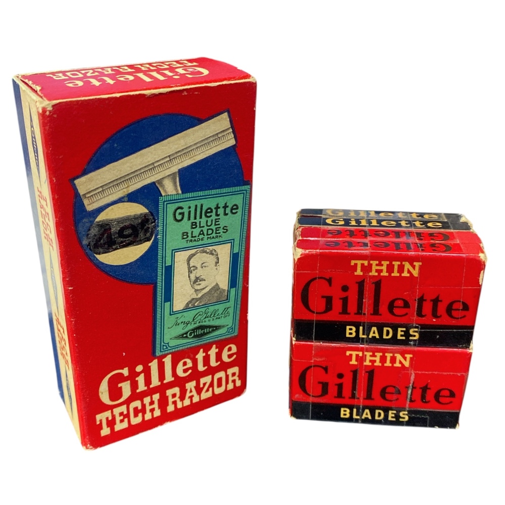 • Gillette Thin Blades: First introduced during World War II as an economical alternative to heavier blades, Thin blades remained a recognizable part of the Gillette blade lineup with distinctive labeling.