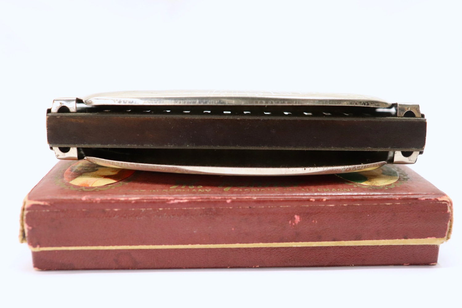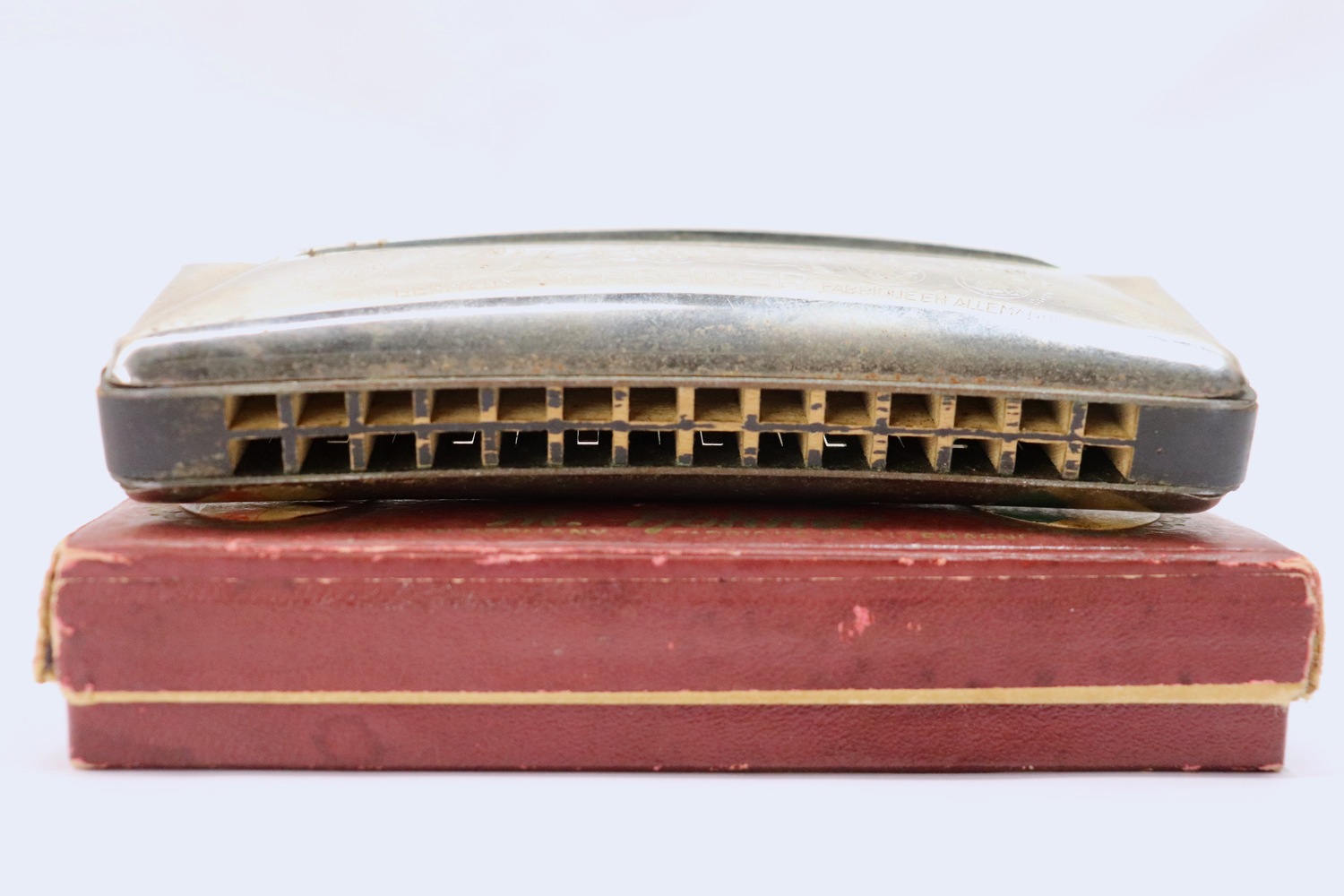 This is a vintage, collectible harmonica sold in original, unrestored condition. While it produces sound, it has not been fully play-tested and may require service or adjustment for regular musical use. Please review all photos carefully.